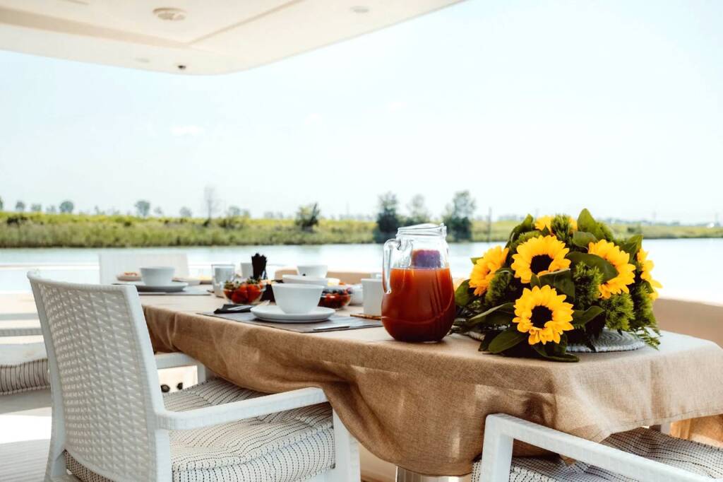 Motoryacht Astondoa 82 GLX Magic Six, Baujahr 2003, liegt im San Giorgio di Nogaro, Friuli-Venezia Giulia, Italien vor Anker. Es verfügt über 4 + 2 Kabinen und bietet Platz für 10 Personen mit 5 Toiletten.