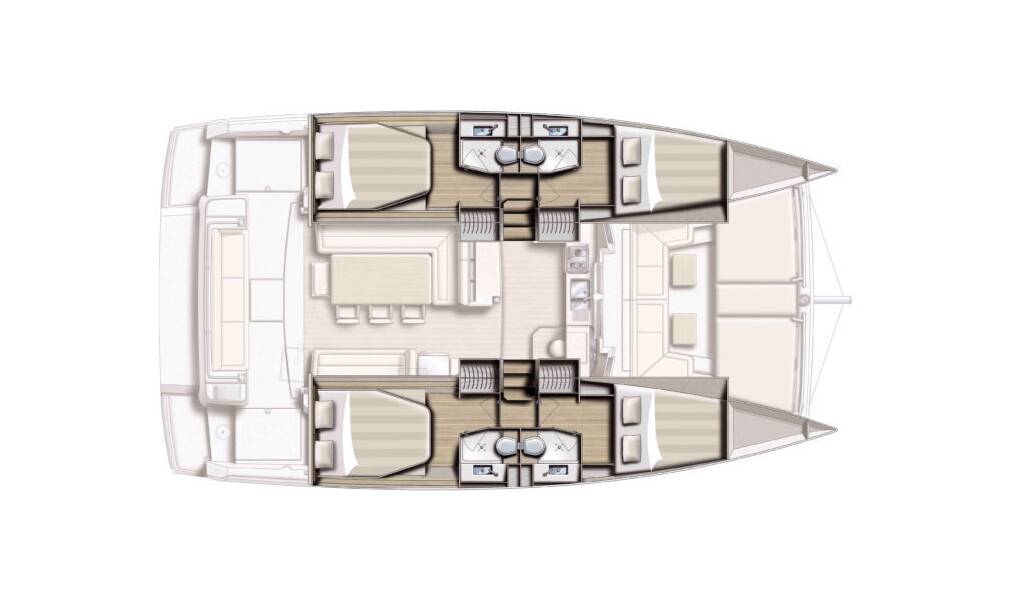 Katamaran Bali 4.1 Efi, Baujahr 2020, liegt im Lefkas, D-Marin, Ionisches Meer, Griechenland vor Anker. Es verfügt über 4 Kabinen und bietet Platz für 8 + 1 Personen mit 4 Toiletten.