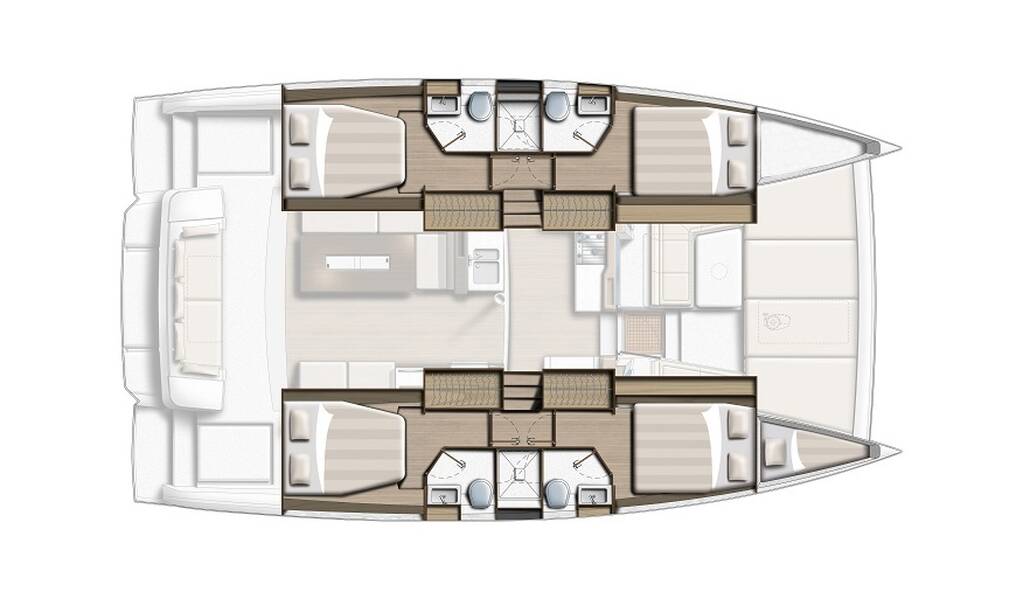 Katamaran Bali 4.2 Au Soleil, Baujahr 2024, liegt im Marina Kastela, Split & Umgebung, Kroatien vor Anker. Es verfügt über 4 + 1 Kabinen und bietet Platz für 8 + 2 + 1 Personen mit 4 Toiletten.