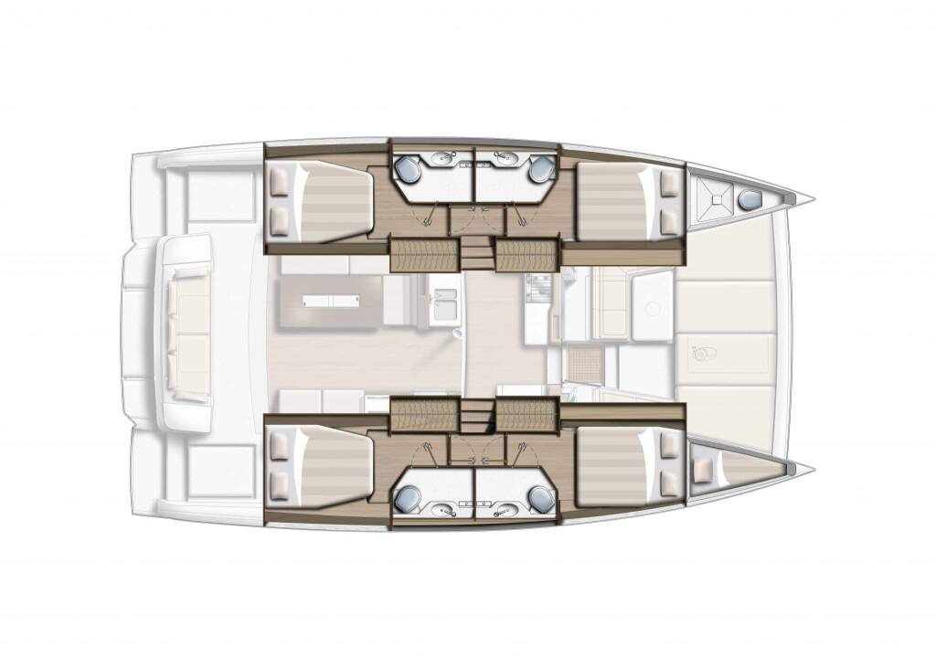 Katamaran Bali 4.2 Beta, Baujahr 2023, liegt im Porto di Cecina, Toskana, Italien vor Anker. Es verfügt über 4 + 1 Kabinen und bietet Platz für 8 + 1 Personen mit 4 + 1 Toiletten.
