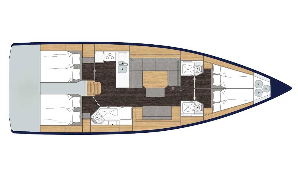 Segelyacht Bavaria C45 Black Velvet, Baujahr 2023, liegt im Corfu, Gouvia Marina, Ionisches Meer, Griechenland vor Anker. Es verfügt über 4 Kabinen und bietet Platz für 8 + 1 Personen mit 3 Toiletten.