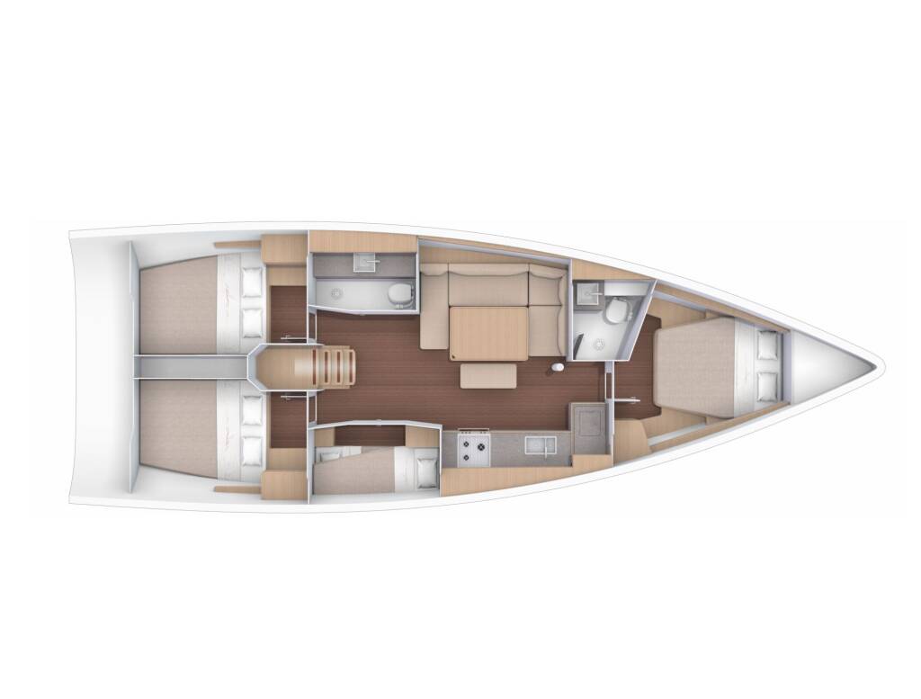 Segelyacht Dufour 430 Thymus, Baujahr 2023, liegt im Sardinia, Punta Nuraghe, Sardinien, Italien vor Anker. Es verfügt über 4 Kabinen und bietet Platz für 8 Personen mit 2 Toiletten.