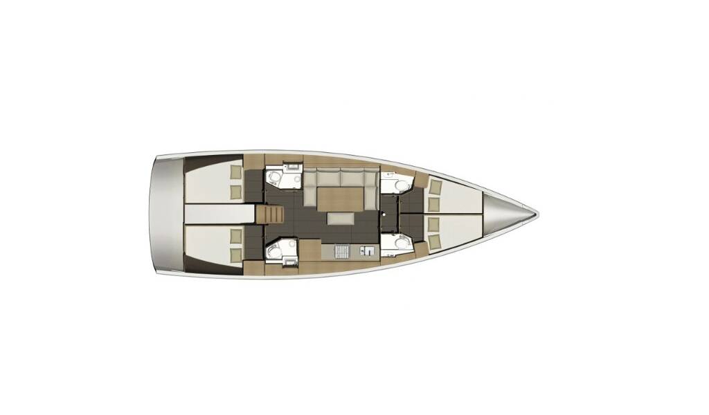 Segelyacht Dufour 460 GL Kosmopolitan, Baujahr 2019, liegt im Lefkas, Marina Syvota, Ionisches Meer, Griechenland vor Anker. Es verfügt über 4 Kabinen und bietet Platz für 8 + 2 Personen mit 4 Toiletten.