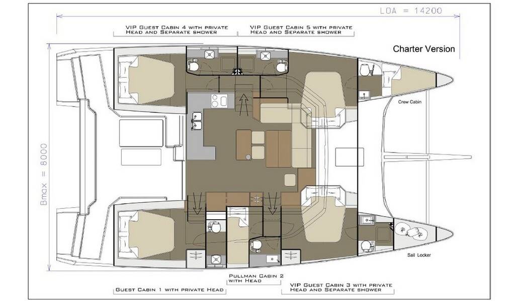 Katamaran Dufour 48 Catamaran Freya, Baujahr 2025, liegt im Marina Pirovac, Sibenik & Umgebung, Kroatien vor Anker. Es verfügt über 5 + 1 Kabinen und bietet Platz für 10 + 1 + 1 Personen mit 5 + 1 Toiletten.
