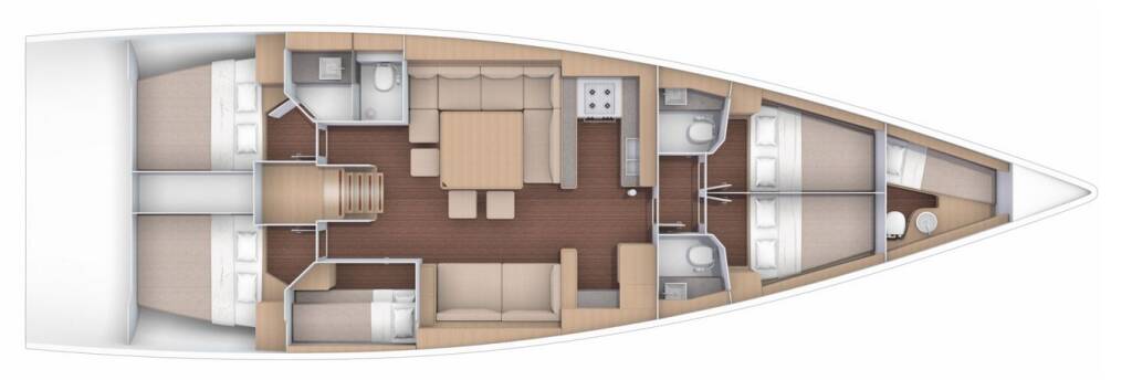 Segelyacht Dufour 56 Exclusive Albus, Baujahr 2024, liegt im Marina di Portisco, Sardinien, Italien vor Anker. Es verfügt über 5 + 1 Kabinen und bietet Platz für 10 + 1 Personen mit 3 + 1 Toiletten.