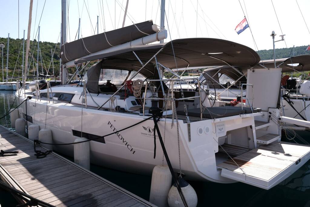 Segelyacht Dufour 560 GL Petrovich, Baujahr 2016, liegt im Marina Kremik, Primosten, Sibenik & Umgebung, Kroatien vor Anker. Es verfügt über 4 + 1 Kabinen und bietet Platz für 8 + 2 + 1 Personen mit 4 + 1 Toiletten.