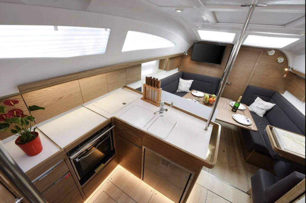 Segelyacht Elan Impression 40 Val, Baujahr 2017, liegt im Olive Island Marina, Sutomiscica (Ugljan), Zadar & Umgebung, Kroatien vor Anker. Es verfügt über 3 Kabinen und bietet Platz für 6 + 2 Personen mit 2 Toiletten.
