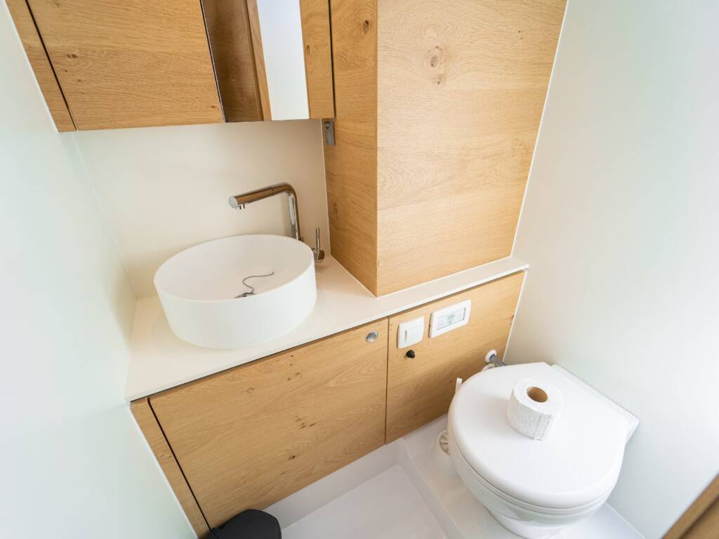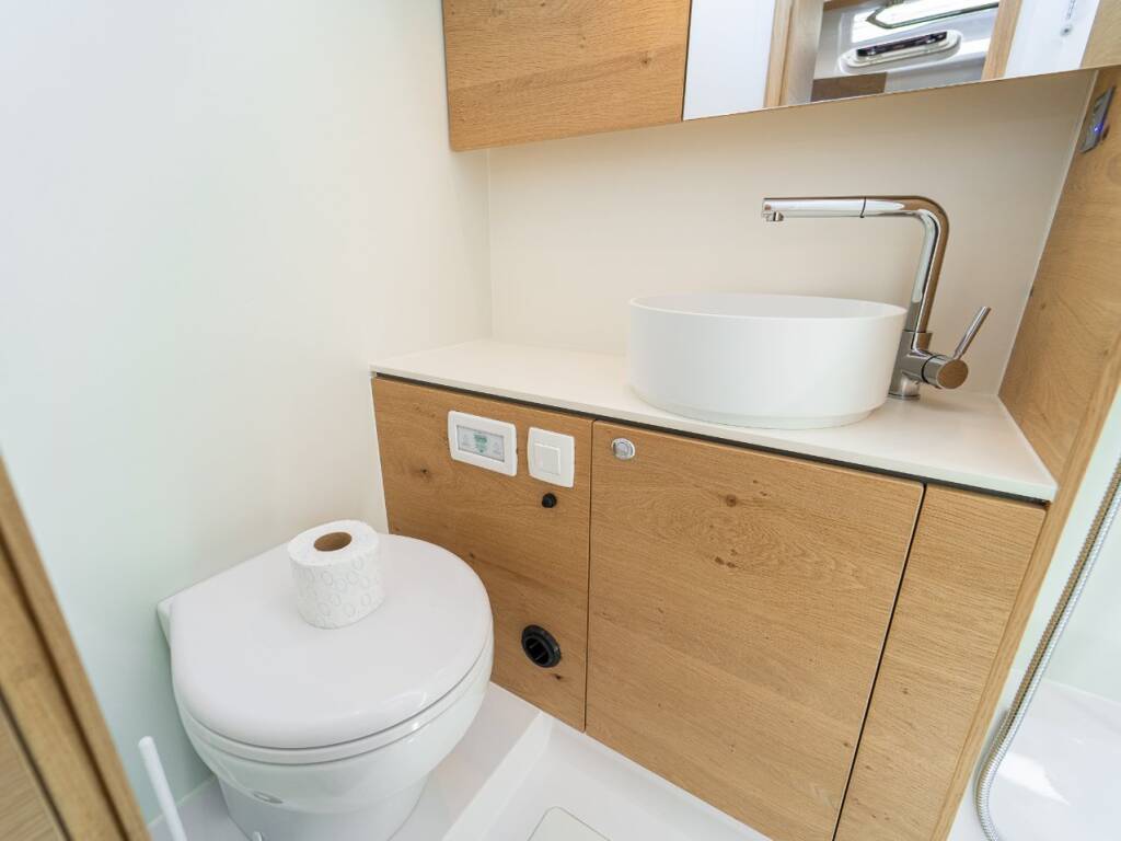Segelyacht Elan Impression 45 Trinity, Baujahr 2023, liegt im Marina Kastela, Split & Umgebung, Kroatien vor Anker. Es verfügt über 4 Kabinen und bietet Platz für 8 + 2 Personen mit 2 Toiletten.