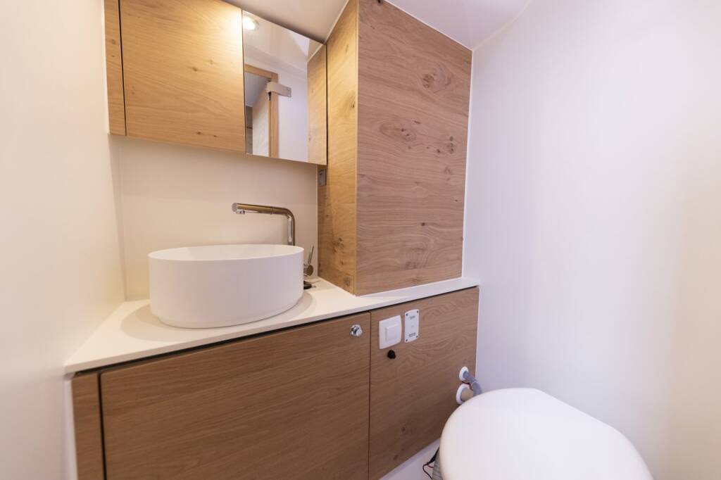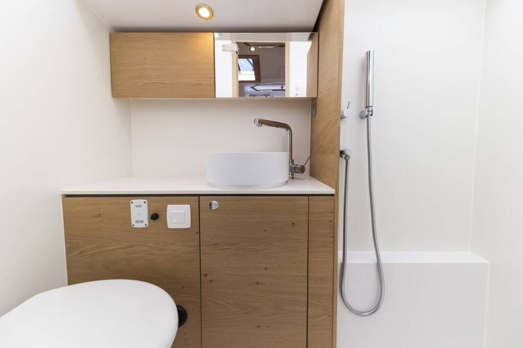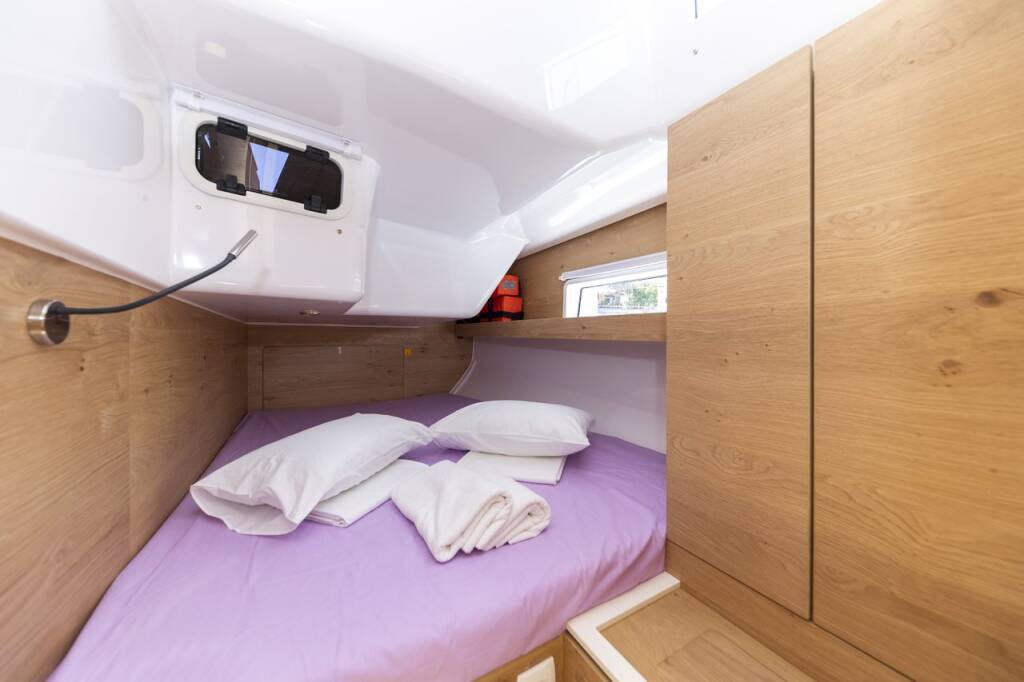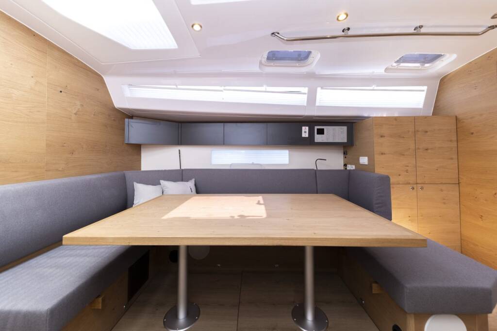 Segelyacht Elan Impression 45 Vekenega, Baujahr 2023, liegt im Marina Zadar (ex. Tankerkomerc), Zadar & Umgebung, Kroatien vor Anker. Es verfügt über 4 Kabinen und bietet Platz für 8 + 2 Personen mit 2 Toiletten.
