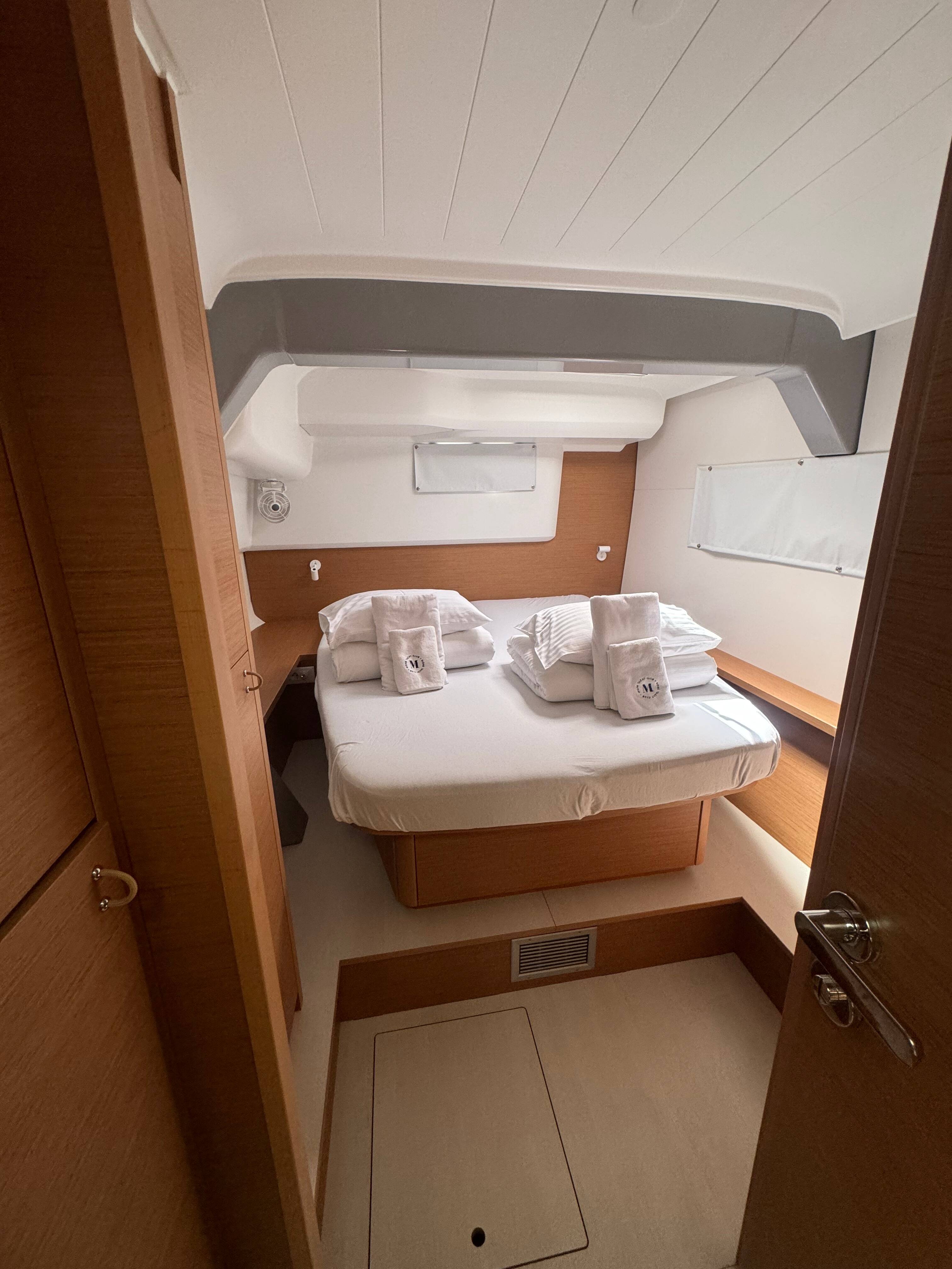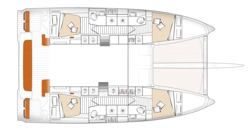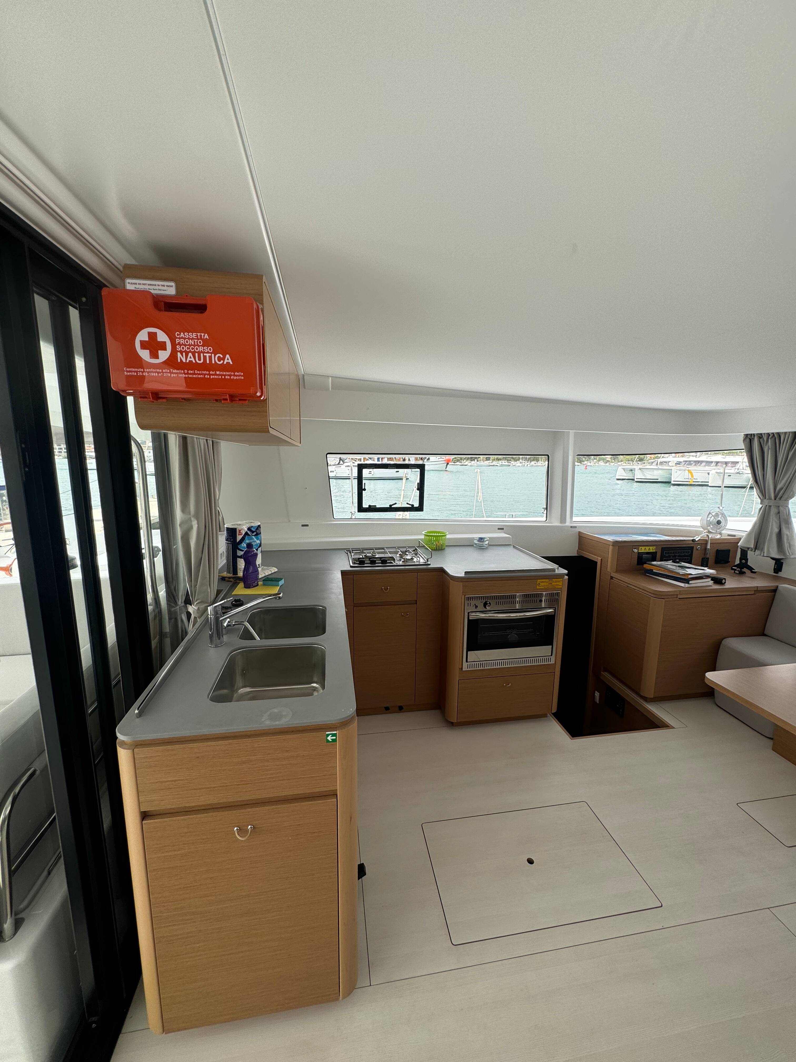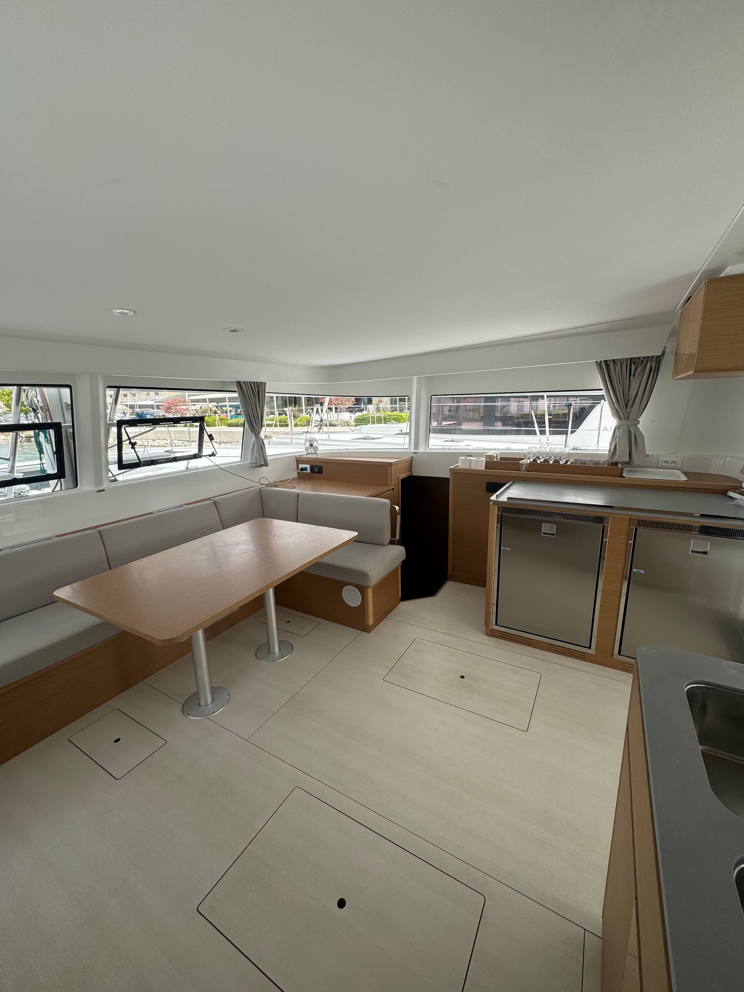 Katamaran Excess 14 Princess Rita, Baujahr 2024, liegt im Trogir, Yachtclub Seget (Marina Baotić), Split & Umgebung, Kroatien vor Anker. Es verfügt über 4 + 2 Kabinen und bietet Platz für 8 + 2 + 2 Personen mit 4 Toiletten.