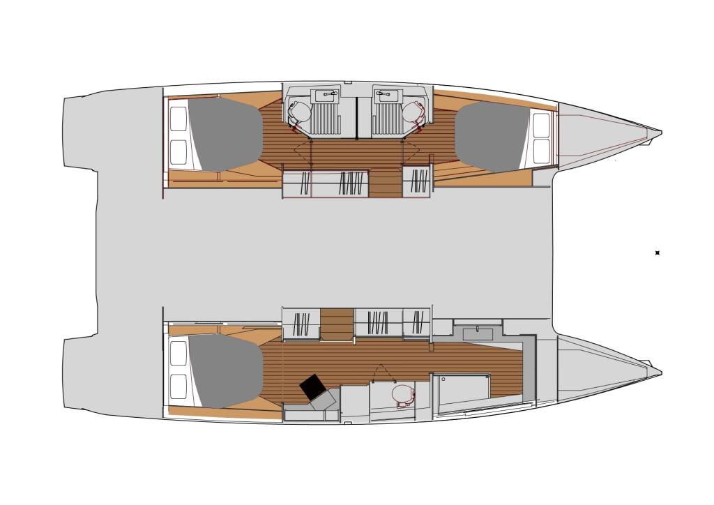 Katamaran Fountaine Pajot Astrea 42 Bollinger, Baujahr 2025, liegt im Olbia, Marina di Cugnana, Sardinien, Italien vor Anker. Es verfügt über 3 + 1 Kabinen und bietet Platz für 6 + 2 + 1 Personen mit 3 Toiletten.