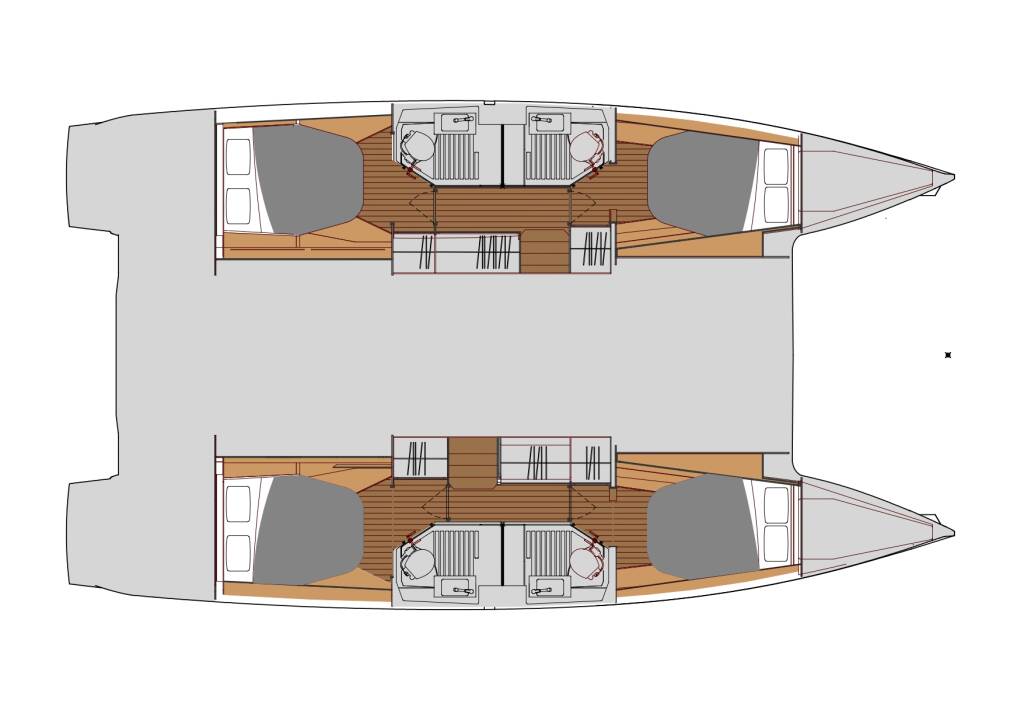 Katamaran Fountaine Pajot Astrea 42 Deutz, Baujahr 2025, liegt im Marina D'Arechi, Campania, Italien vor Anker. Es verfügt über 4 + 1 Kabinen und bietet Platz für 8 + 2 + 1 Personen mit 4 Toiletten.