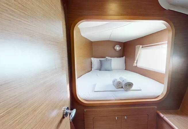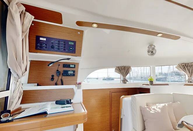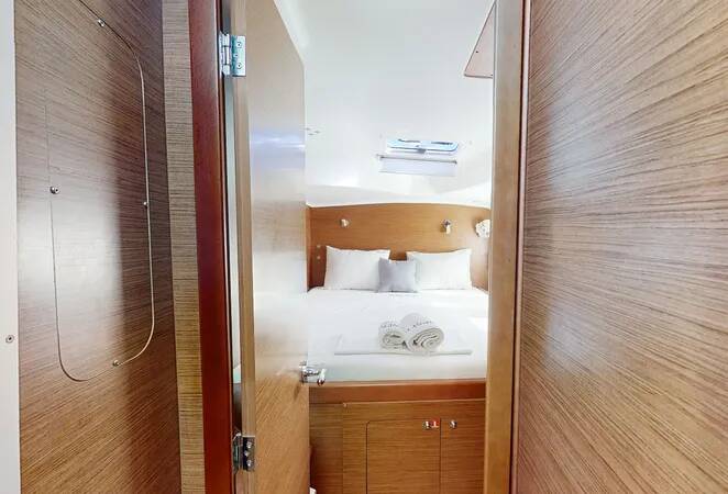 Katamaran Lagoon 380 S2 Why Knot, Baujahr 2018, liegt im Lefkas, Perigiali, Ionisches Meer, Griechenland vor Anker. Es verfügt über 4 + 2 Kabinen und bietet Platz für 8 + 2 Personen mit 2 Toiletten.