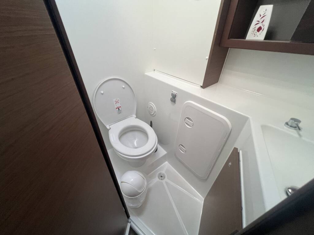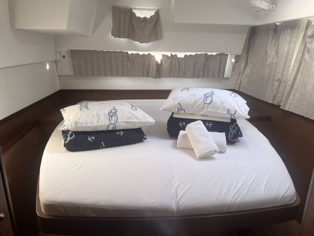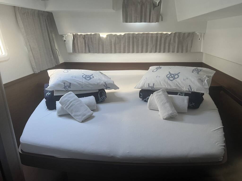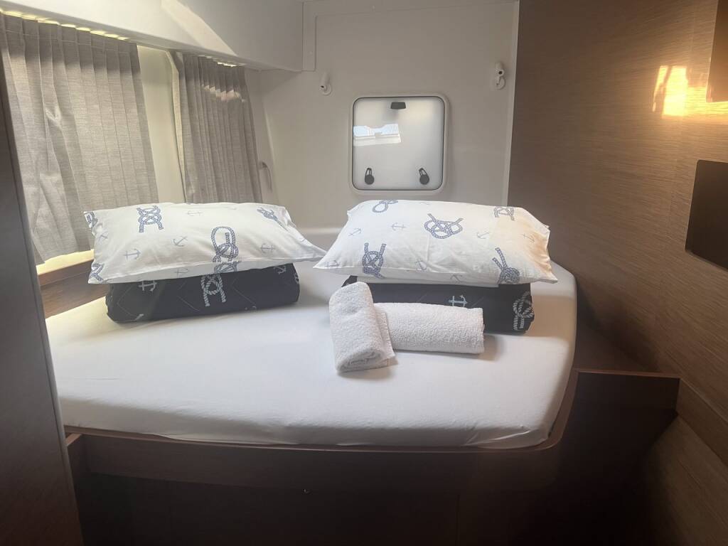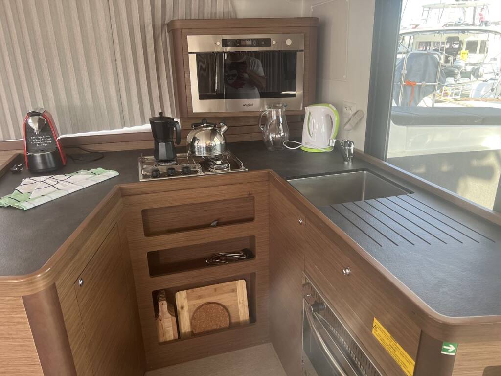 Katamaran Lagoon 42 Adventure, Baujahr 2022, liegt im ACI Marina Split, Split & Umgebung, Kroatien vor Anker. Es verfügt über 4 + 2 Kabinen und bietet Platz für 8 + 2 + 2 Personen mit 4 Toiletten.