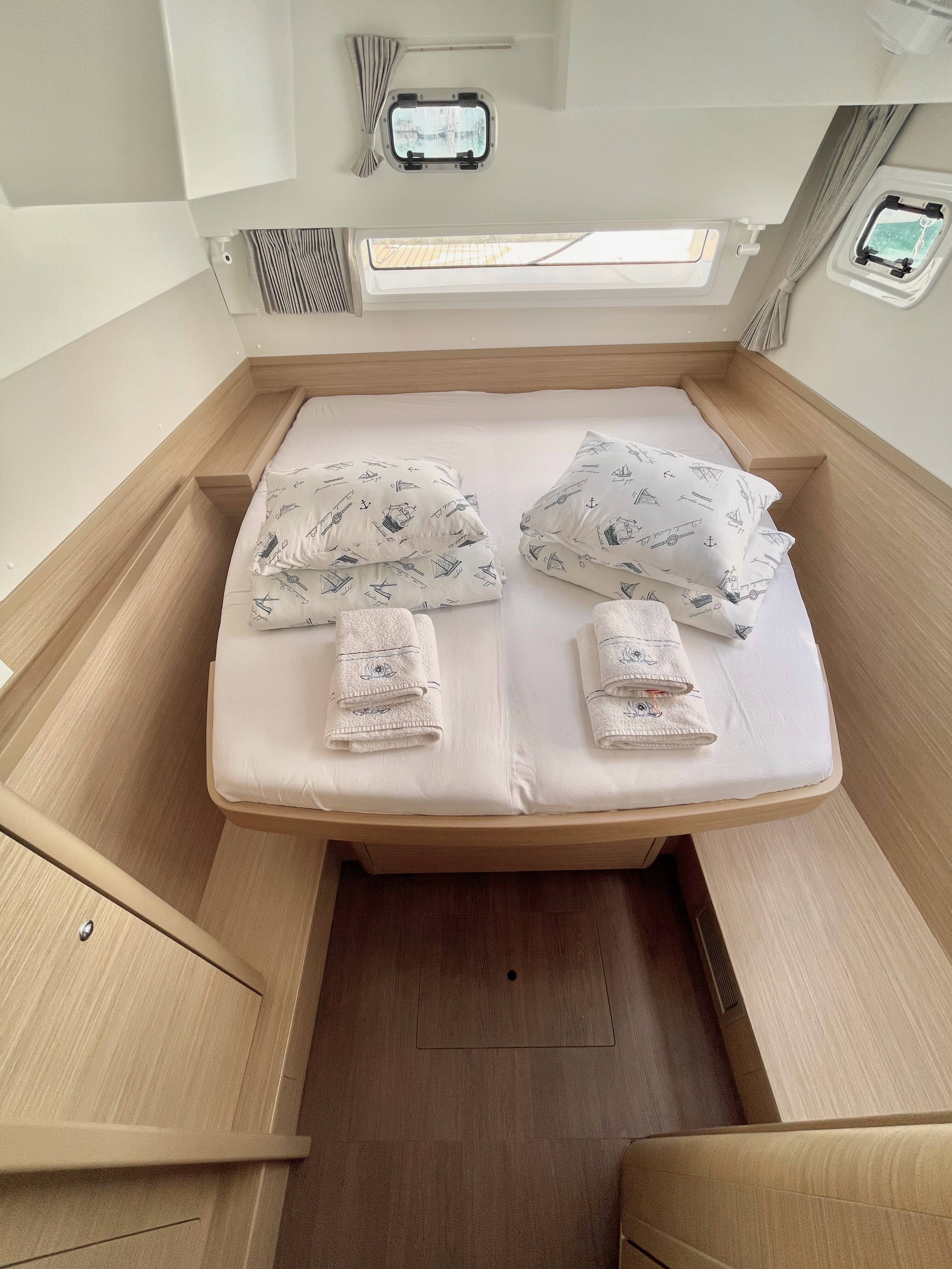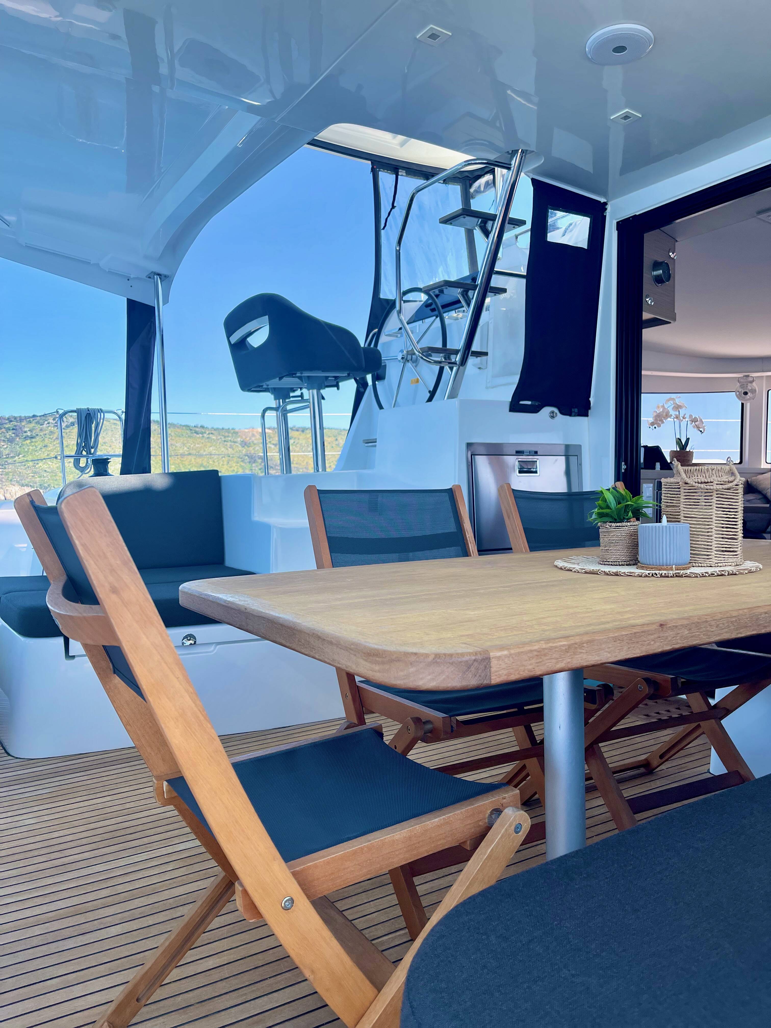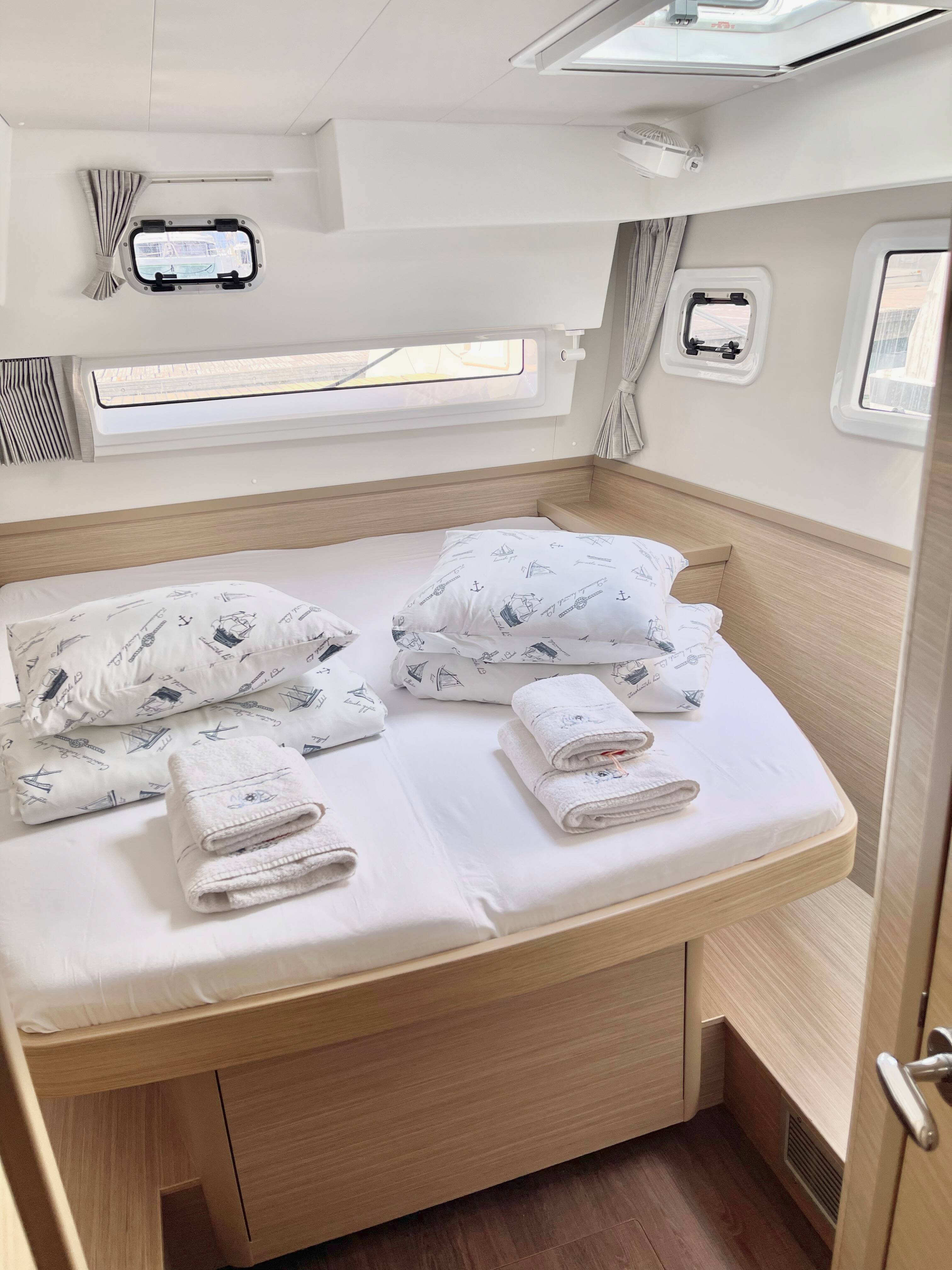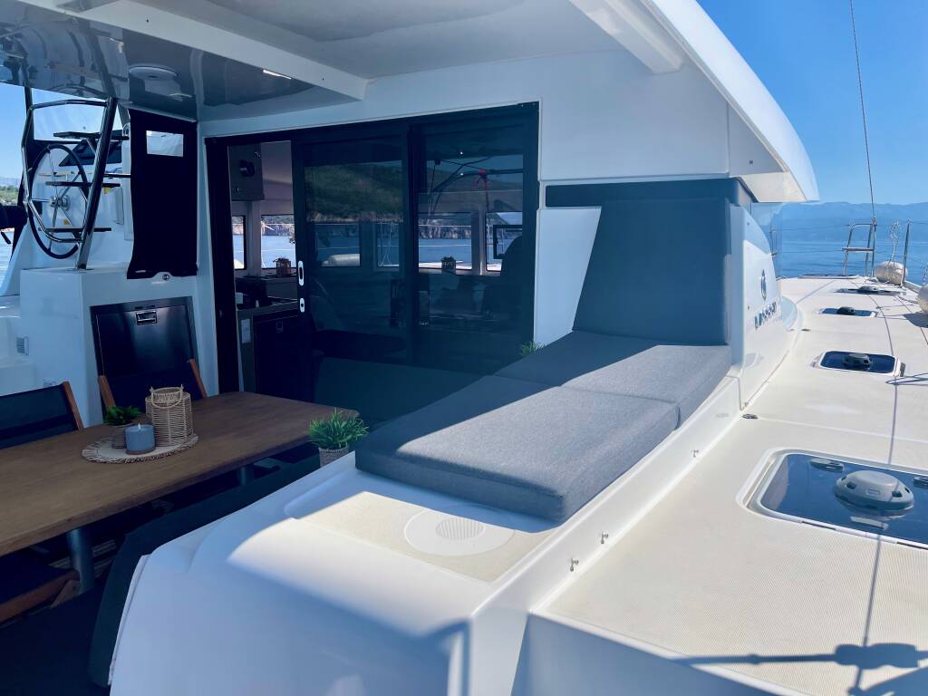 Katamaran Lagoon 42 Bendmill, Baujahr 2023, liegt im Marina Kastela, Split & Umgebung, Kroatien vor Anker. Es verfügt über 4 + 1 Kabinen und bietet Platz für 8 + 2 + 1 Personen mit 4 Toiletten.