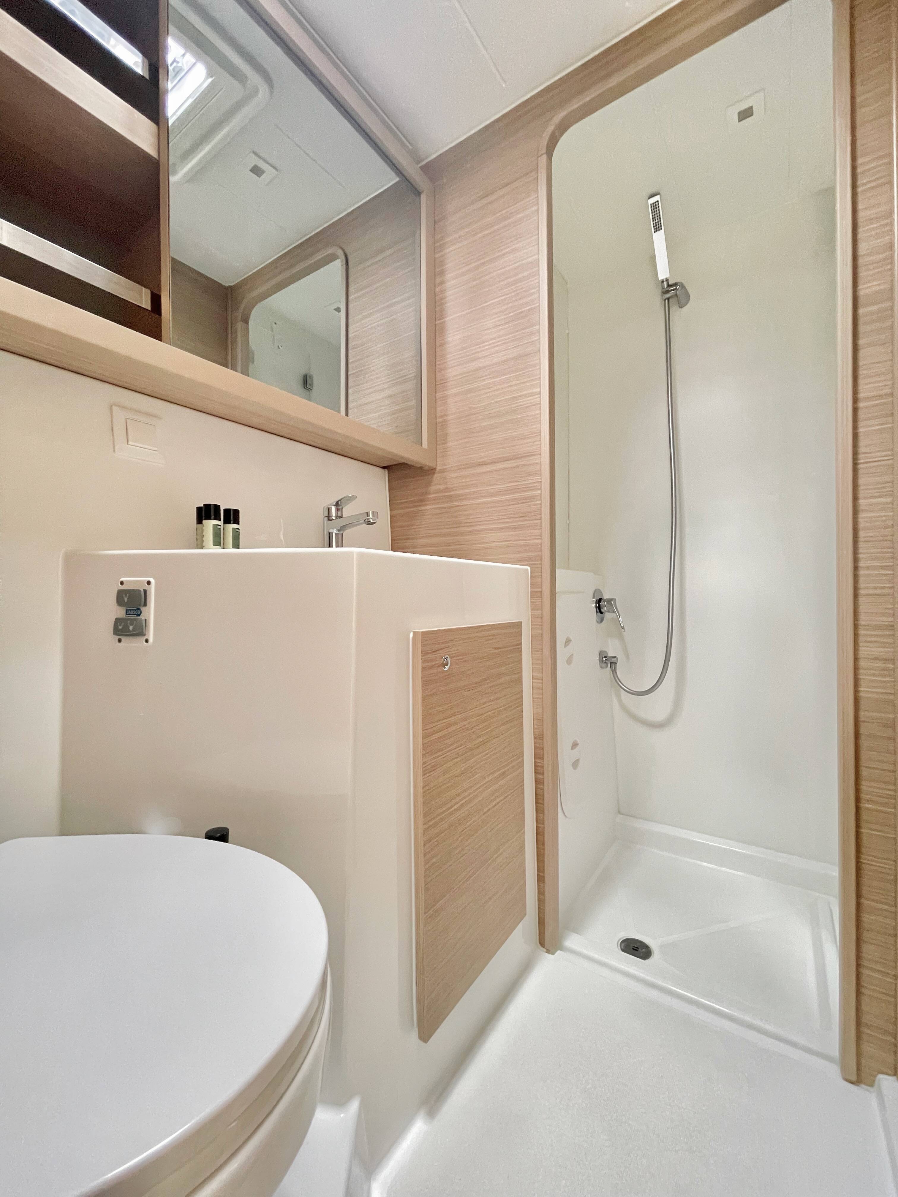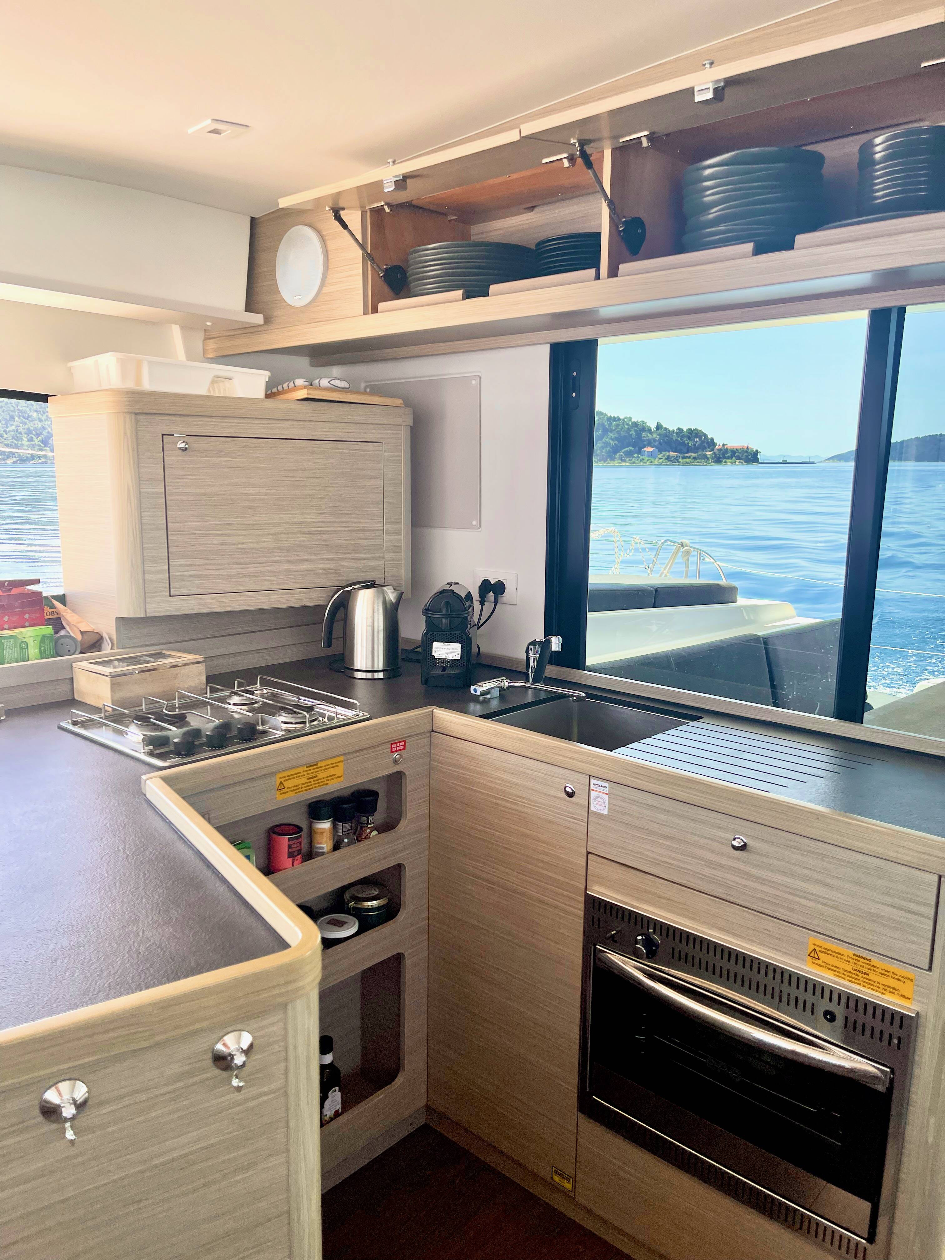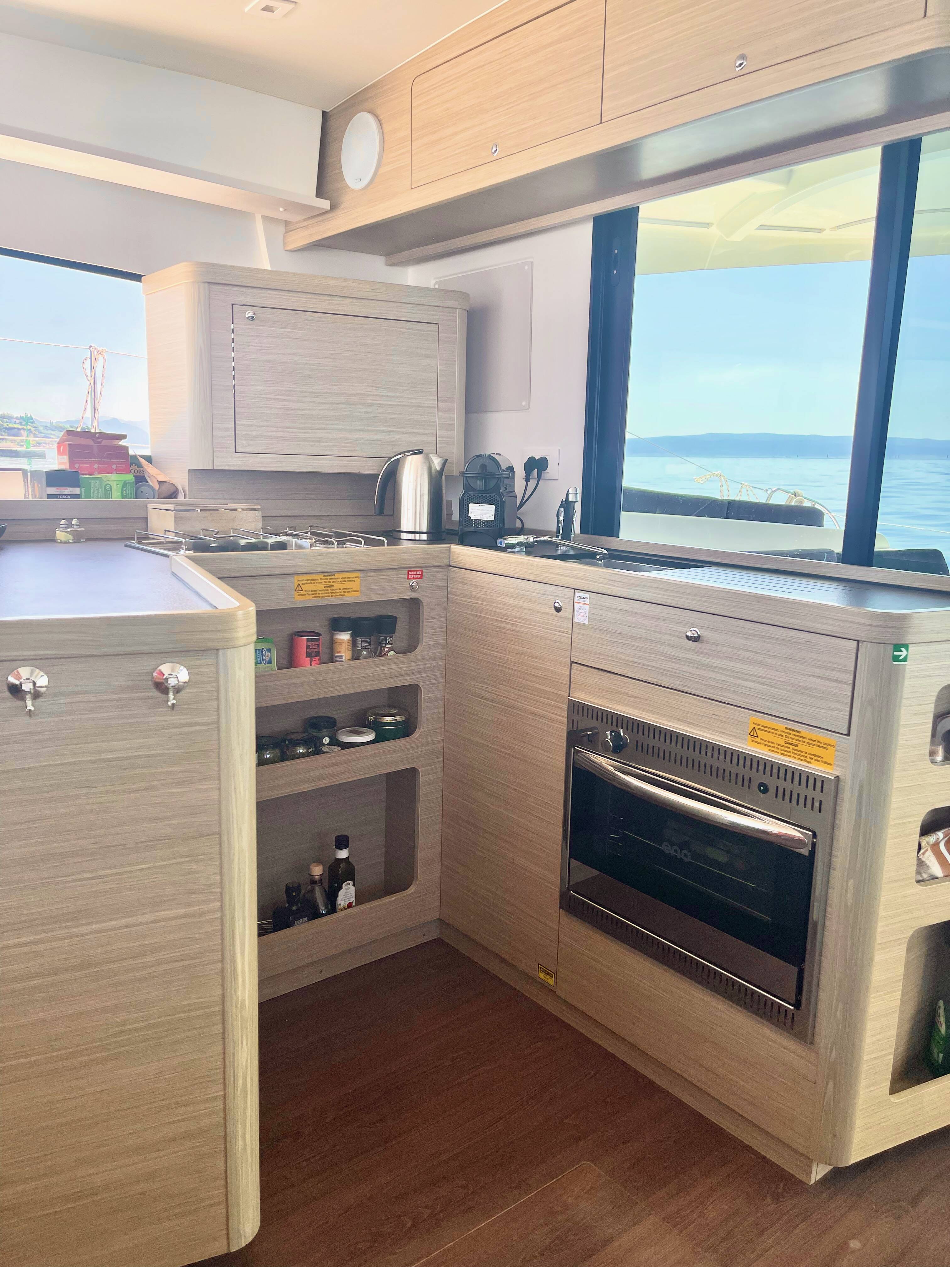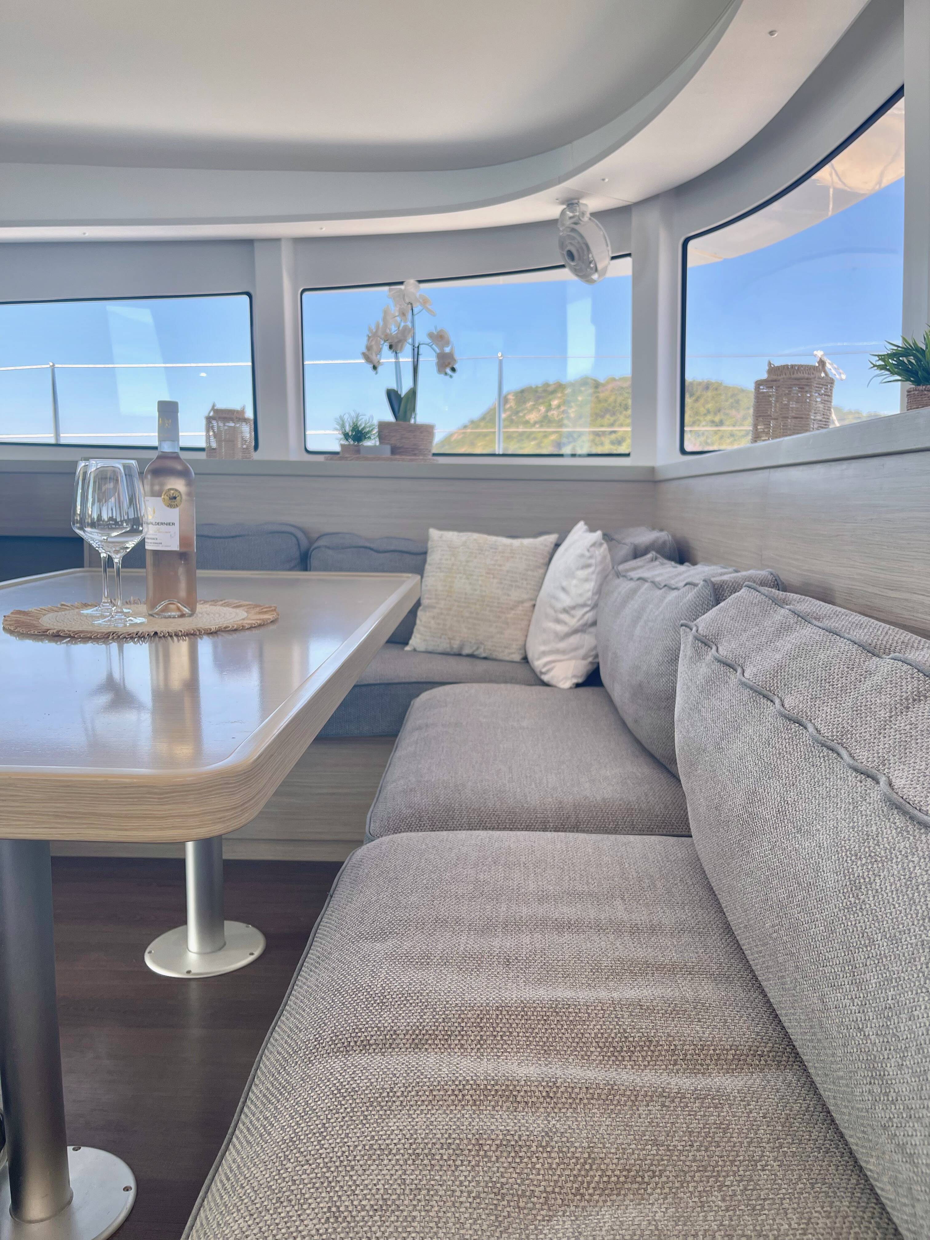 Katamaran Lagoon 42 Bendmill, Baujahr 2023, liegt im Marina Kastela, Split & Umgebung, Kroatien vor Anker. Es verfügt über 4 + 1 Kabinen und bietet Platz für 8 + 2 + 1 Personen mit 4 Toiletten.