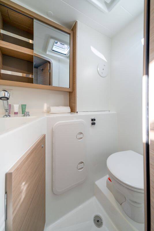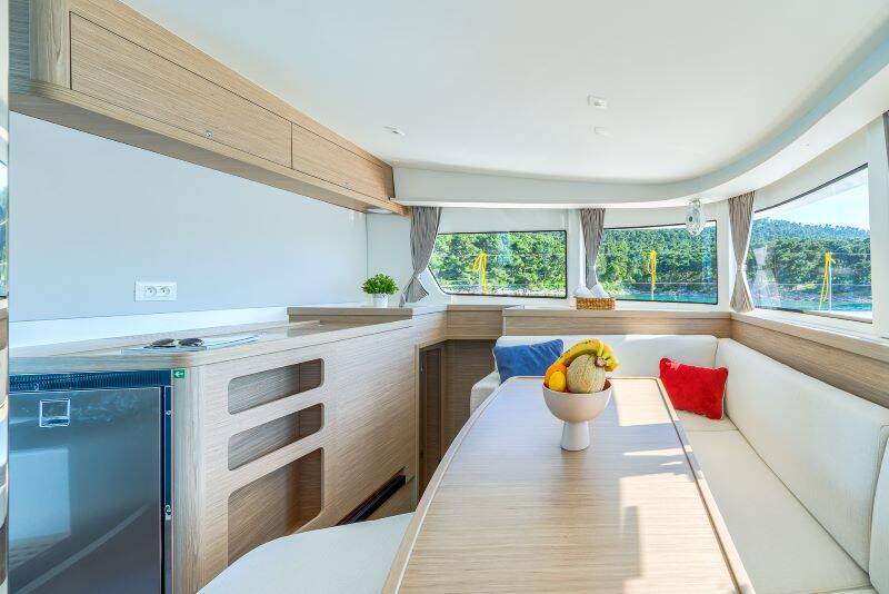 Katamaran Lagoon 42 Olyntha, Baujahr 2025, liegt im Marina Kastela, Split & Umgebung, Kroatien vor Anker. Es verfügt über 4 + 2 Kabinen und bietet Platz für 8 + 2 + 2 Personen mit 4 Toiletten.