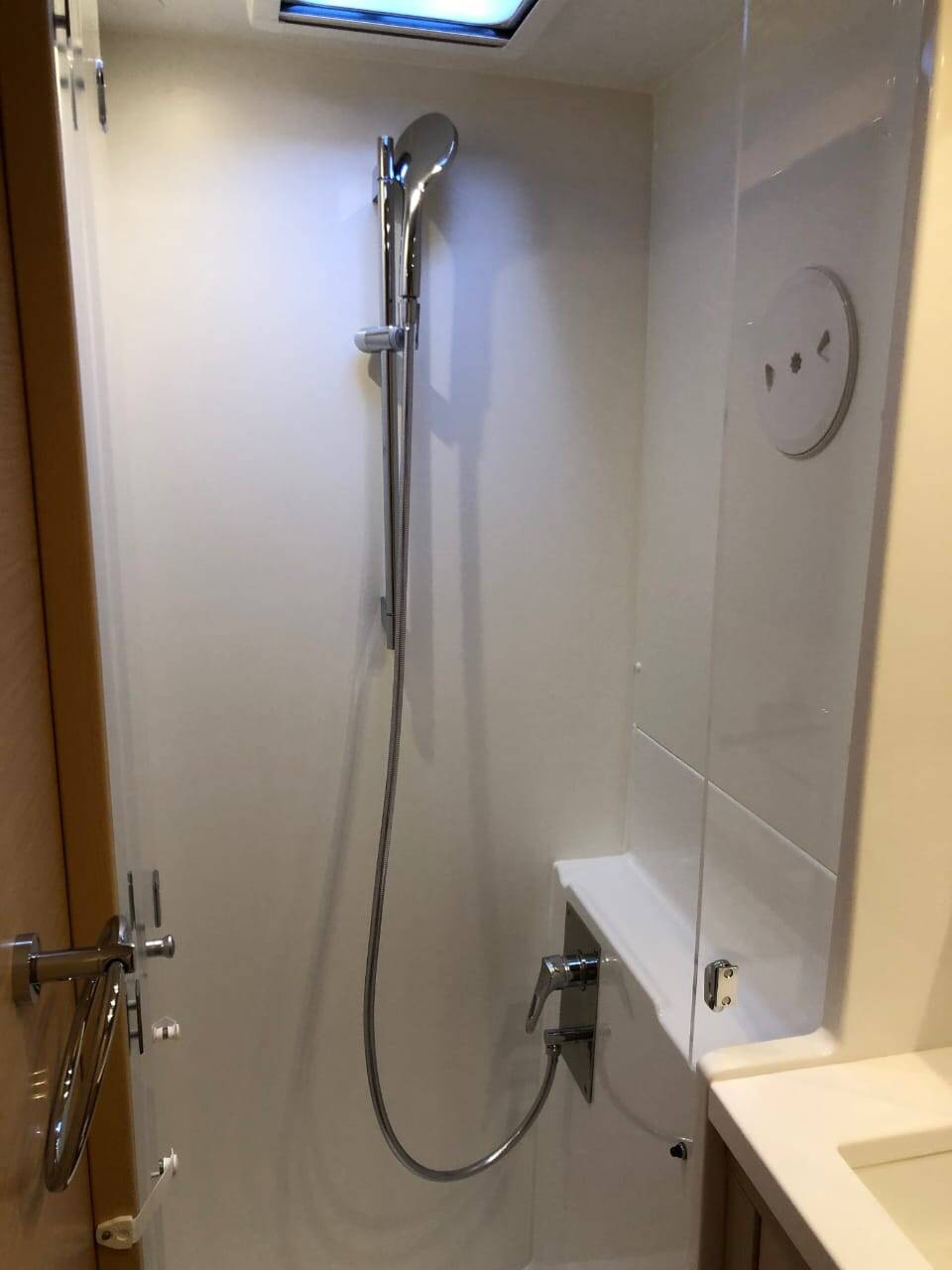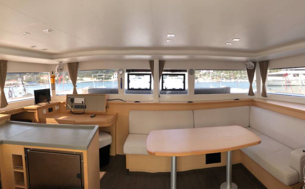Katamaran Lagoon 450 F Aristofanis, Baujahr 2019, liegt im Lefkas main port, Ionisches Meer, Griechenland vor Anker. Es verfügt über 4 + 2 Kabinen und bietet Platz für 8 + 2 Personen mit 4 + 1 Toiletten.