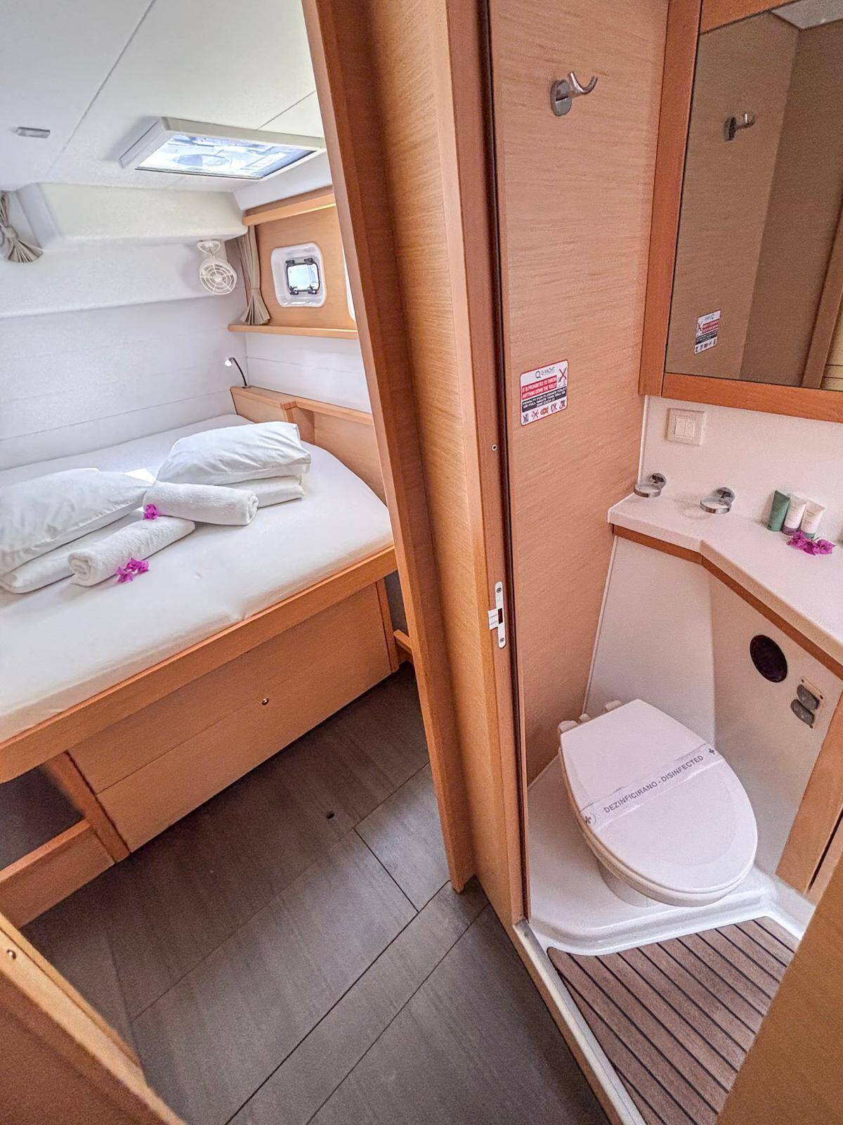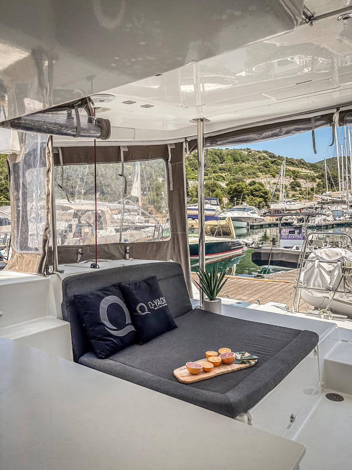Katamaran Lagoon 450 F Red Twin, Baujahr 2016, liegt im Marina Kremik, Primosten, Sibenik & Umgebung, Kroatien vor Anker. Es verfügt über 4 + 2 Kabinen und bietet Platz für 8 + 2 + 2 Personen mit 4 Toiletten.