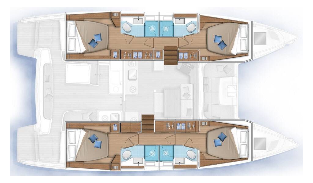 Katamaran Lagoon 46 El Marita, Baujahr 2021, liegt im Lefkas, D-Marin, Ionisches Meer, Griechenland vor Anker. Es verfügt über 4 + 2 Kabinen und bietet Platz für 8 + 2 Personen mit 4 + 1 Toiletten.