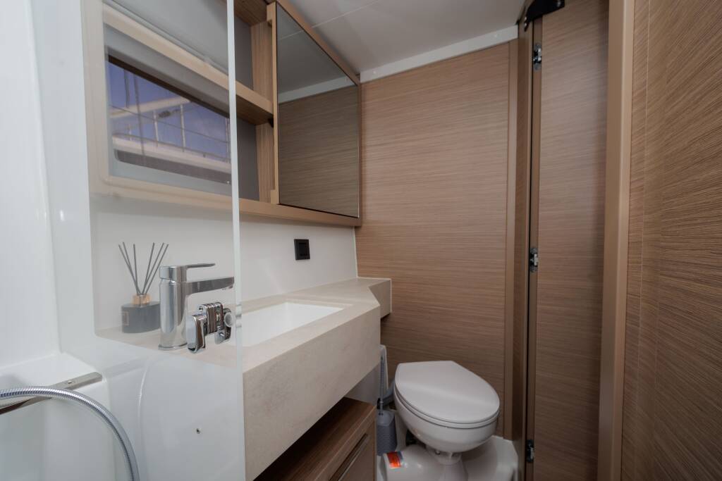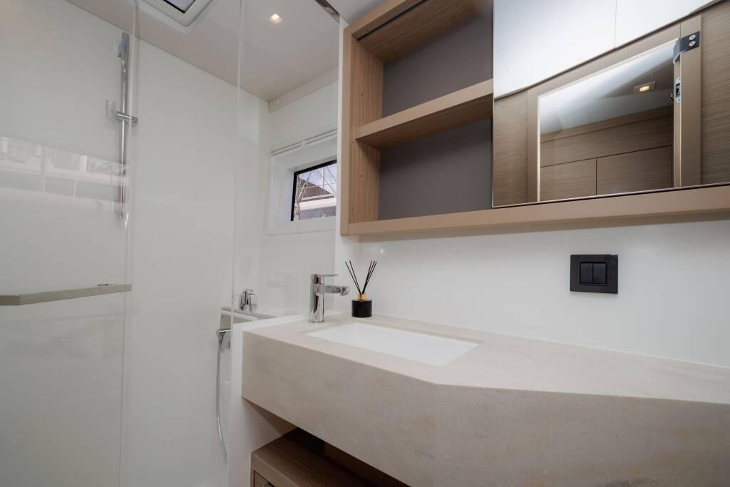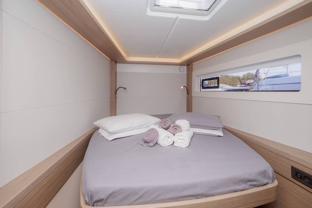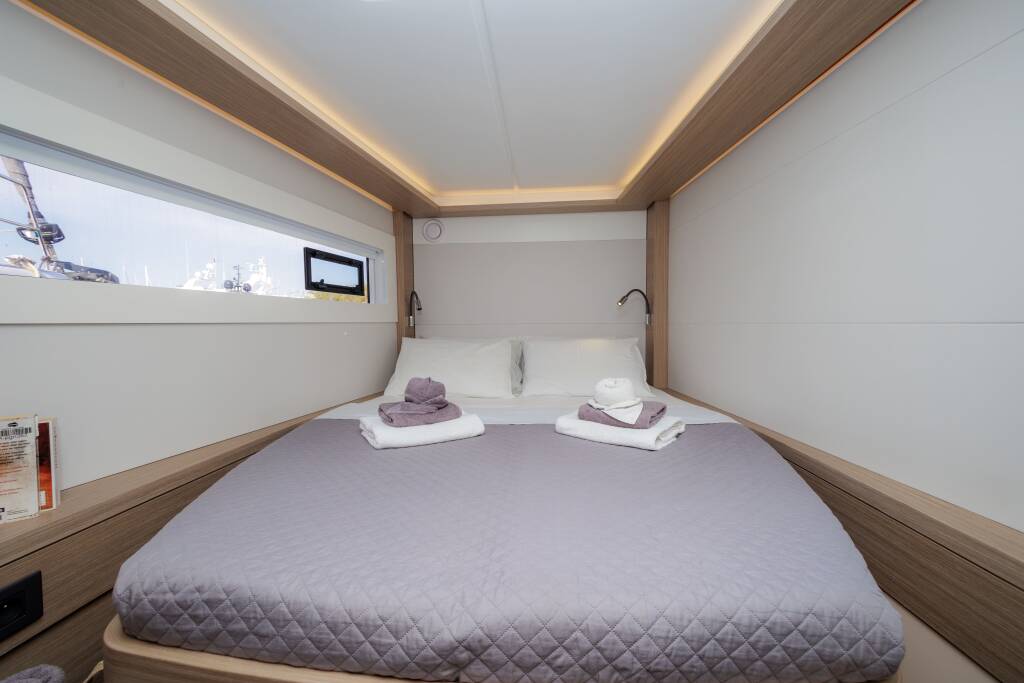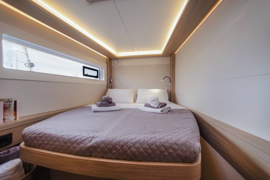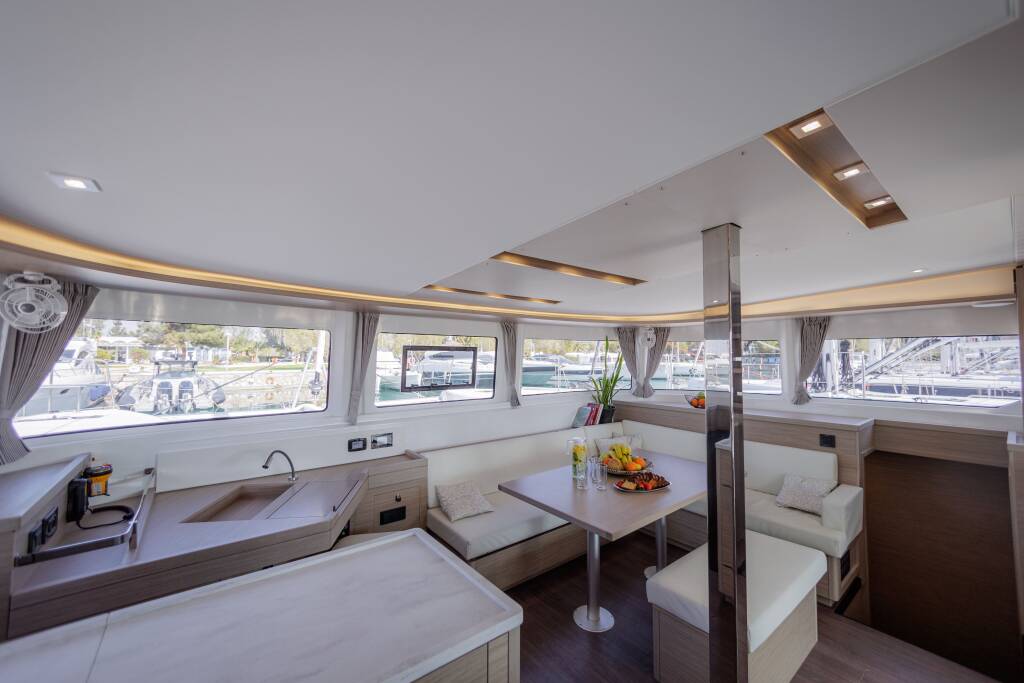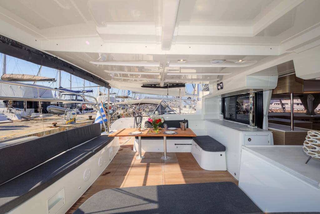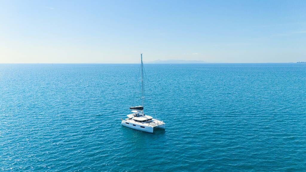 Katamaran Lagoon 46 Iris, Baujahr 2025, liegt im Athens, Alimos marina, Athens area/Saronic/Peloponese, Griechenland vor Anker. Es verfügt über 4 + 2 Kabinen und bietet Platz für 8 + 2 Personen mit 4 + 2 Toiletten.