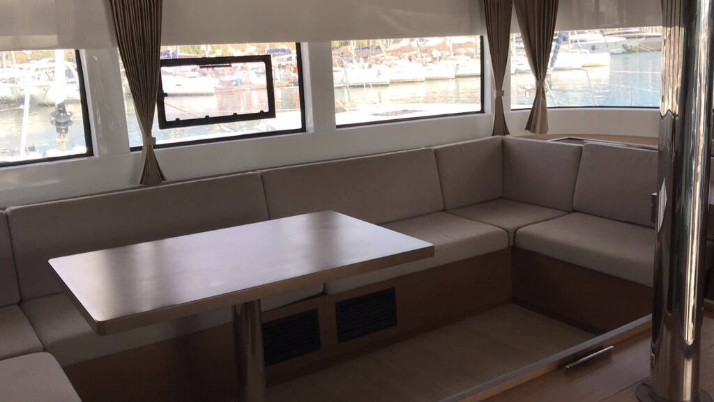 Katamaran Lagoon 50 Ioli, Baujahr 2019, liegt im Athens, Alimos marina, Athens area/Saronic/Peloponese, Griechenland vor Anker. Es verfügt über 6 Kabinen und bietet Platz für 12 Personen mit 6 Toiletten.