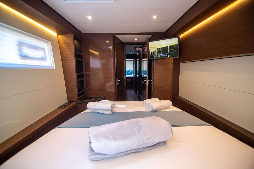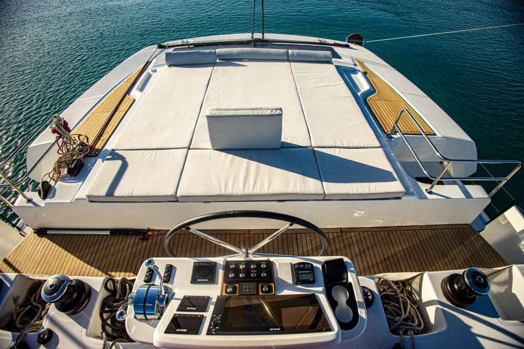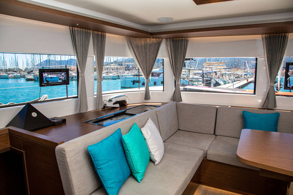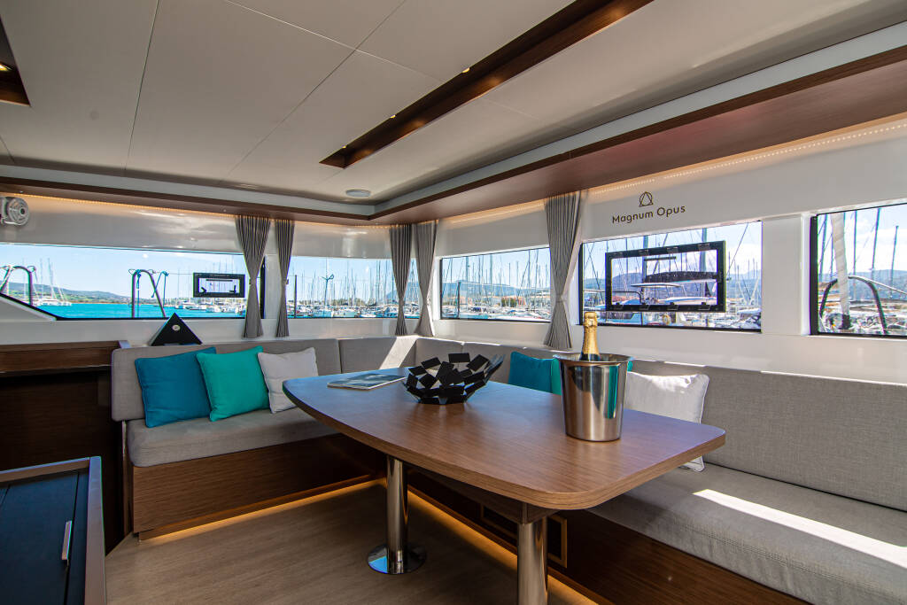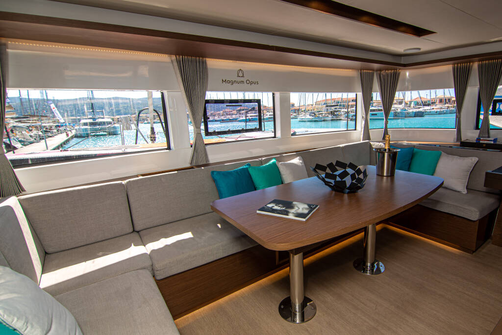 Katamaran Lagoon 50 Magnum Opus, Baujahr 2022, liegt im Preveza Main Port, Ionisches Meer, Griechenland vor Anker. Es verfügt über 6 + 2 Kabinen und bietet Platz für 12 + 2 Personen mit 4 + 2 Toiletten.