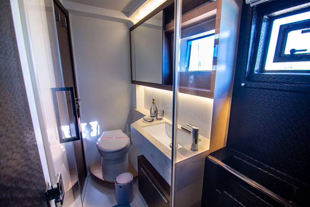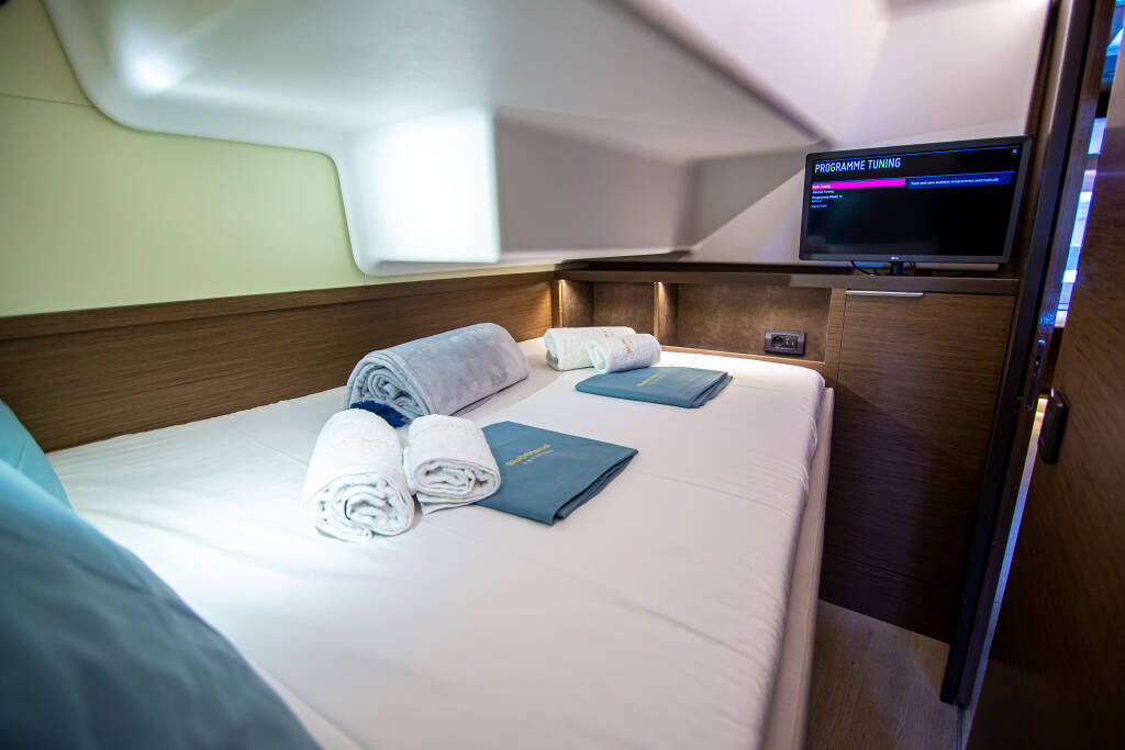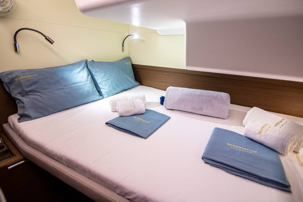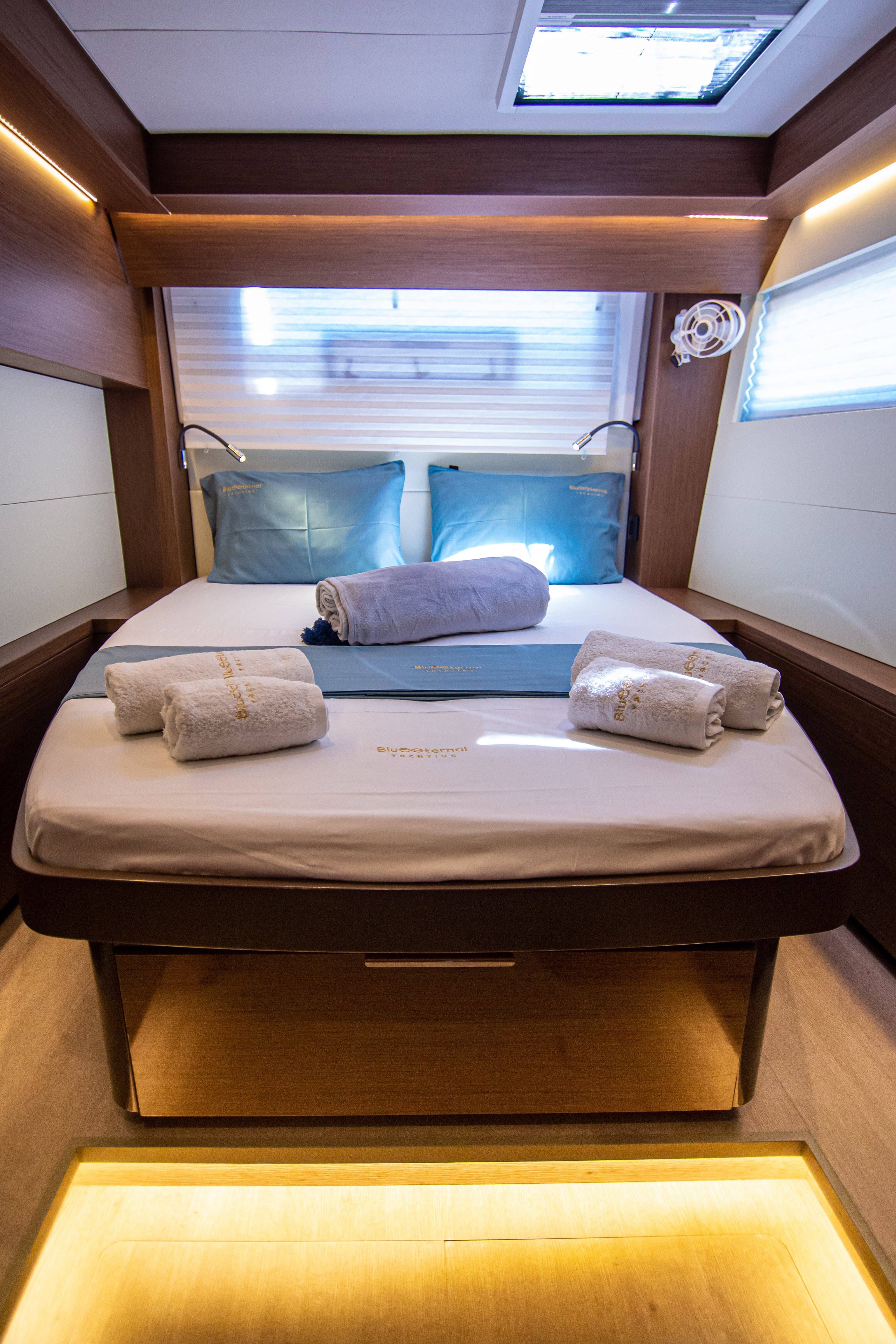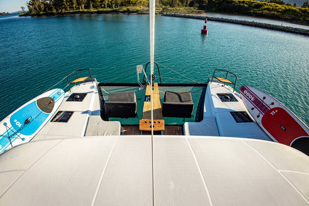 Katamaran Lagoon 50 Magnum Opus, Baujahr 2022, liegt im Preveza Main Port, Ionisches Meer, Griechenland vor Anker. Es verfügt über 6 + 2 Kabinen und bietet Platz für 12 + 2 Personen mit 4 + 2 Toiletten.
