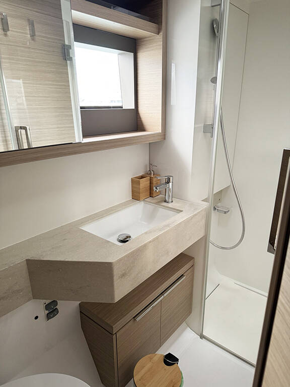 Katamaran Lagoon 51 Spring, Baujahr 2024, liegt im Athens, Alimos marina, Athens area/Saronic/Peloponese, Griechenland vor Anker. Es verfügt über 6 + 2 Kabinen und bietet Platz für 12 Personen mit 4 + 2 Toiletten.