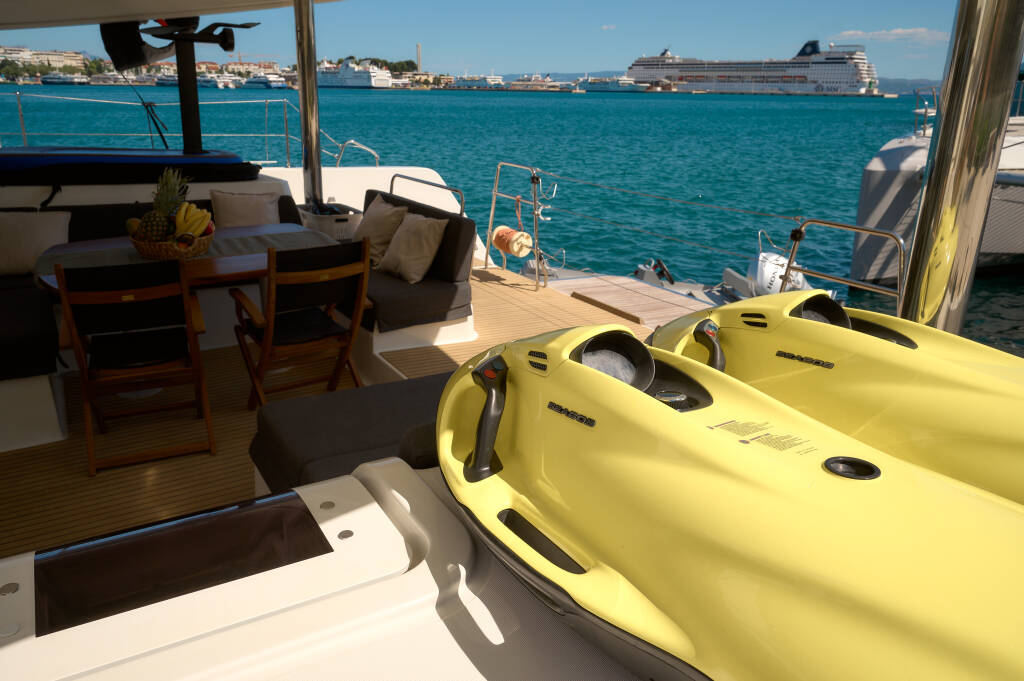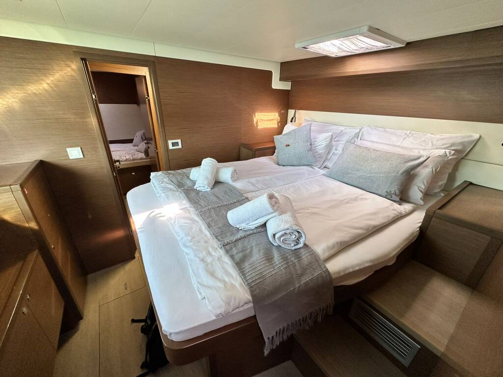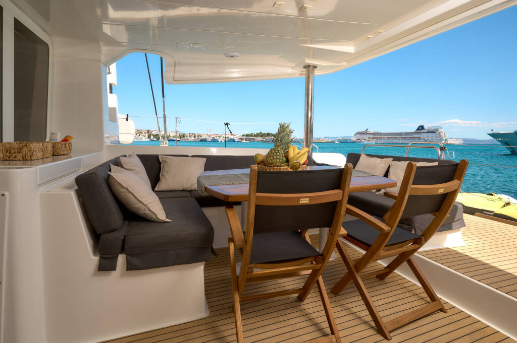 Katamaran Lagoon 52 F Akana, Baujahr 2019, liegt im Trogir, Marina Trogir (ex.SCT), Split & Umgebung, Kroatien vor Anker. Es verfügt über 5 + 2 Kabinen und bietet Platz für 10 + 2 Personen mit 6 Toiletten.