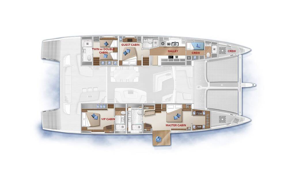 Katamaran Lagoon 77 Adriatic Dragon, Baujahr 2019, liegt im Split, West Coast (Zapadna obala), Split & Umgebung, Kroatien vor Anker. Es verfügt über 4 Kabinen und bietet Platz für 8 Personen mit 4 Toiletten.