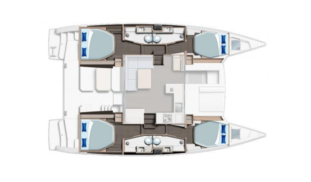 Katamaran Leopard 42 Nicot, Baujahr 2021, liegt im Procida, Campania, Italien vor Anker. Es verfügt über 4 Kabinen und bietet Platz für 8 + 2 Personen mit 4 Toiletten.