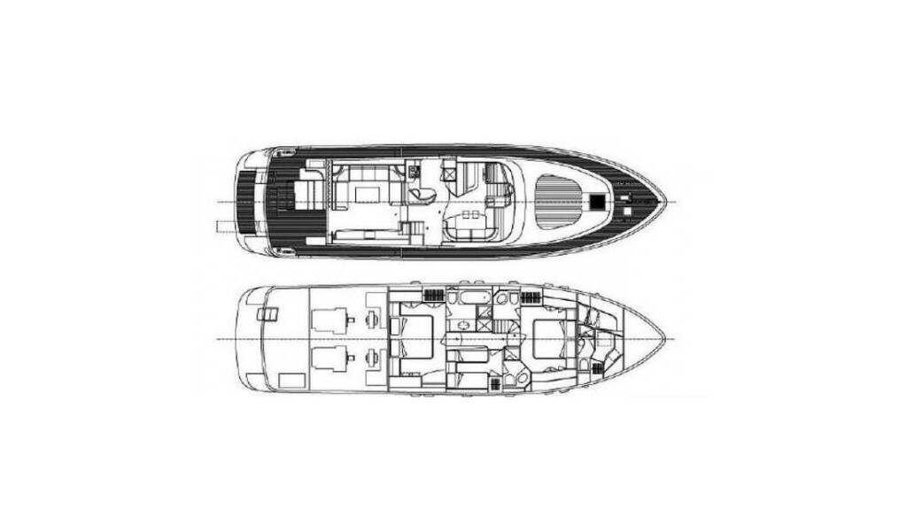 Klimaanlage, ONAN-Generator, Grill, Kühlschrank auf der Flybridge, Wassermacher, Eismaschine, Waschmaschine/Trockner, Geschirrspüler, Mikrowelle, Liegekissen für Deck und Flybridge, hydraulische Gangway mit RC, Badeplattform, Bimini-Top.