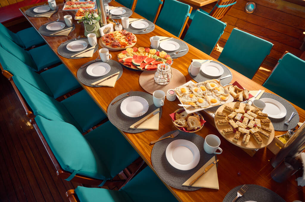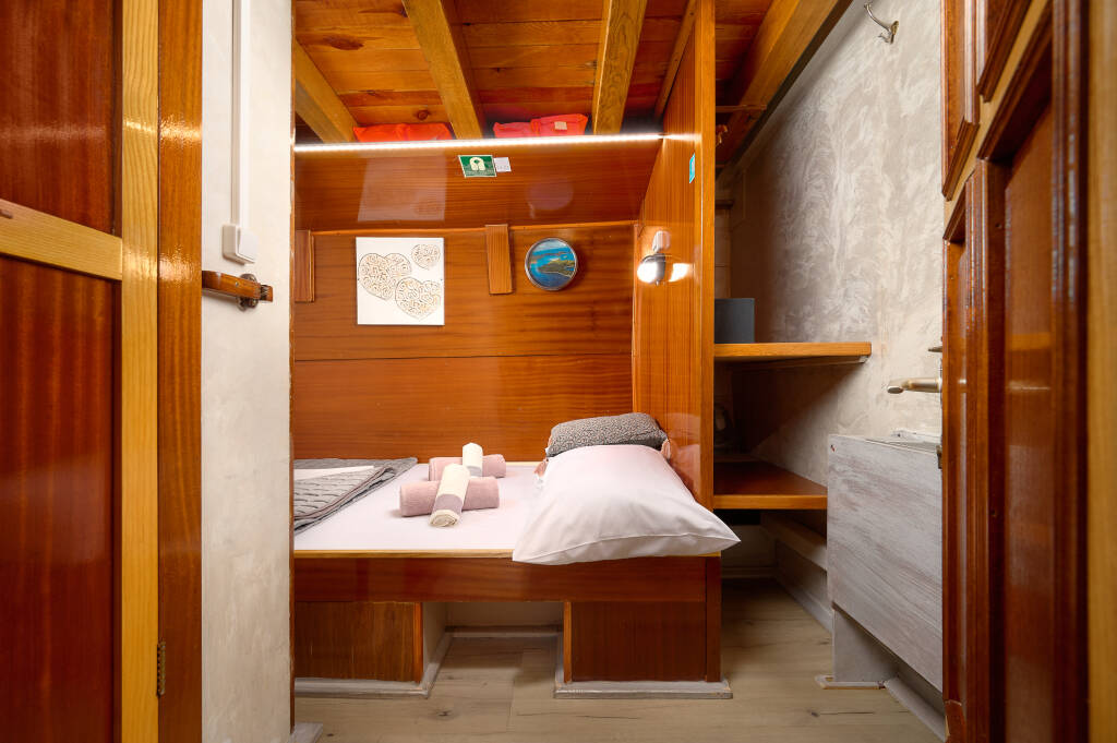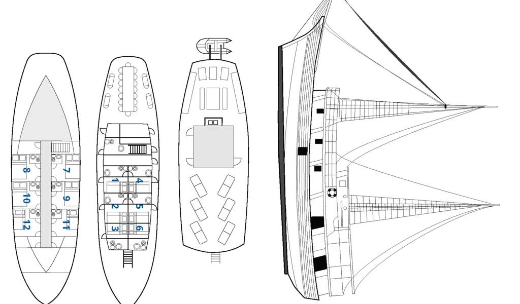 Das Schiff bietet Platz für bis zu 24 Gäste in 12 Kabinen auf dem Haupt- und Unterdeck. Die meisten Kabinen sind für zwei Personen ausgelegt und verfügen entweder über Etagenbetten oder ein Doppelbett. Für Familien mit Kind stehen zwei Dreibettkabinen mit einem Doppelbett und einem zusätzlichen Etagenbett zur Verfügung.