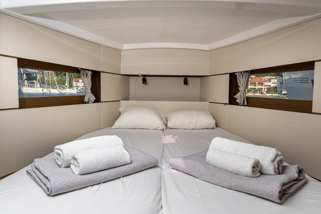 Segelyacht Oceanis 38.1 The Boss, Baujahr 2021, liegt im Palairos, Ionisches Meer, Griechenland vor Anker. Es verfügt über 3 Kabinen und bietet Platz für 6 + 2 Personen mit 2 Toiletten.