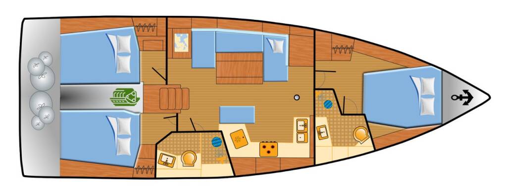 Rudergängersitze mit Holz belegt, elektrische Ankerwinsch mit Fernbedienung, Cockpitdusche mit Warmwasser / Kaltwasser, Aufbaubeleuchtung LED im Cockpit, Indirekte LED-Beleuchtung im Salon, von vorn zu öffnendes Kühlfach, Spülbeckenabdeckung mit Schneidbrett, Fusion-HiFi + Lautsprecher im Innenraum & Wasserdichte Außenlautsprecher, USB-Doppelanschluss im Salon und in den Kabinen, Ladestandsanzeigen Batterien (Bildschirm Navicolor), Insektenschutzgitter an allen ausstellbaren Rumpffenstern, Schutzvorrichtung am Heckspiegel, Schutz Bug, Halterung für den Außenborder, Doppelkoje im Salon, Fußpumpe Seewasser/Frischwasser, Zusätzlicher Frischwassertank 300L (Insgesamt 565L) Komposit Steuerräder schwarz, Rückführung der Fallen zum Cockpit, 2 Genuawinschen, Polyester-Bugplattform mit Ankerrolle und Wasserstag (zum Anschlagen des Gennakers), Gennaker Ausrüstung, Genuaschot-Travellerschienen auf den Seitendecks mit Leinenverstellung, Aufstellbares Fenster, elektrische Fallwinsch.