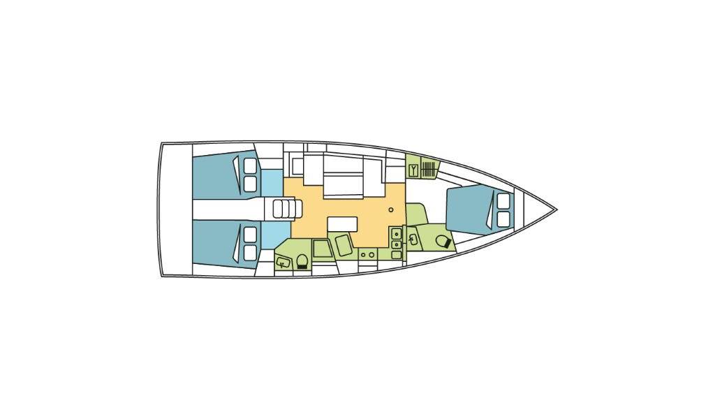Segelyacht Oceanis 40.1 JULIANA, Baujahr 2023, liegt im Kos, Kos Marina, Dodekanes, Griechenland vor Anker. Es verfügt über 3 Kabinen und bietet Platz für 6 + 2 Personen mit 2 Toiletten.