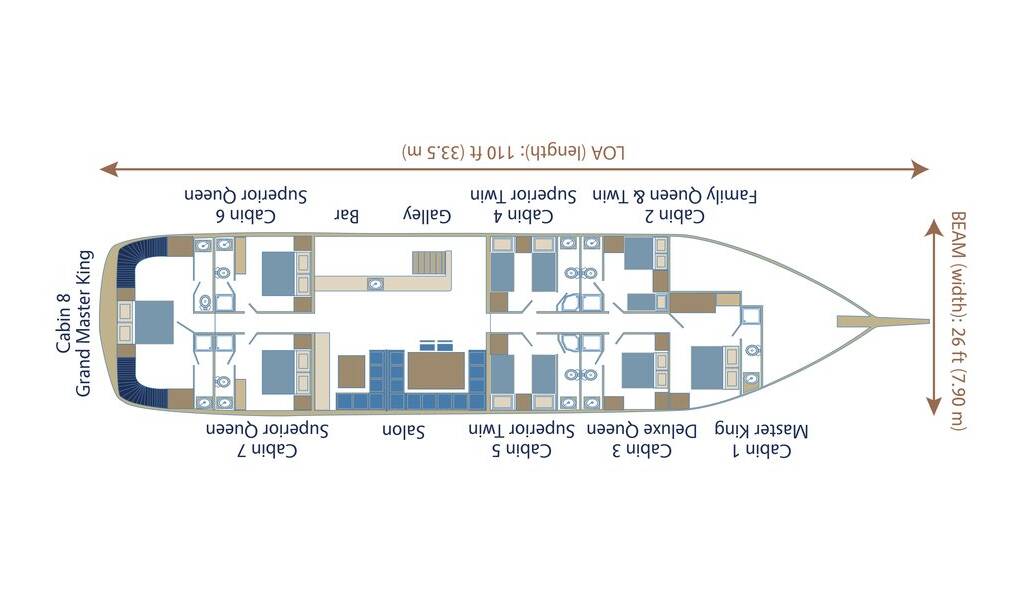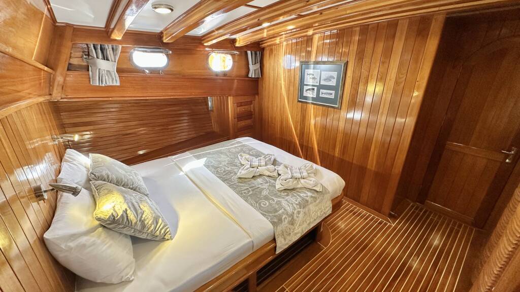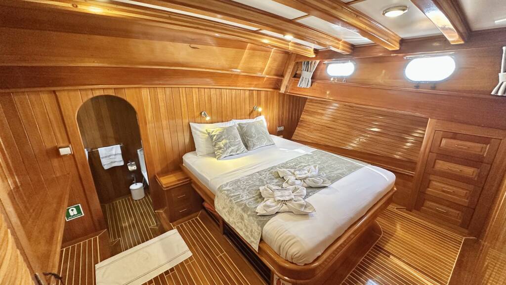 Die Yacht verfügt über acht luxuriöse Kabinen: eine Grand Master, eine Master-Doppelkabine, drei Doppelkabinen, zwei Zweibettkabinen und eine Dreibettkabine. Alle Kabinen verfügen über ein stilvolles eigenes Bad, großzügige Betten, viel Stauraum und einen Haartrockner. Sie bietet Platz für bis zu 17 Gäste und ist ideal für große Gruppen, die mit Einzelpersonen reisen.