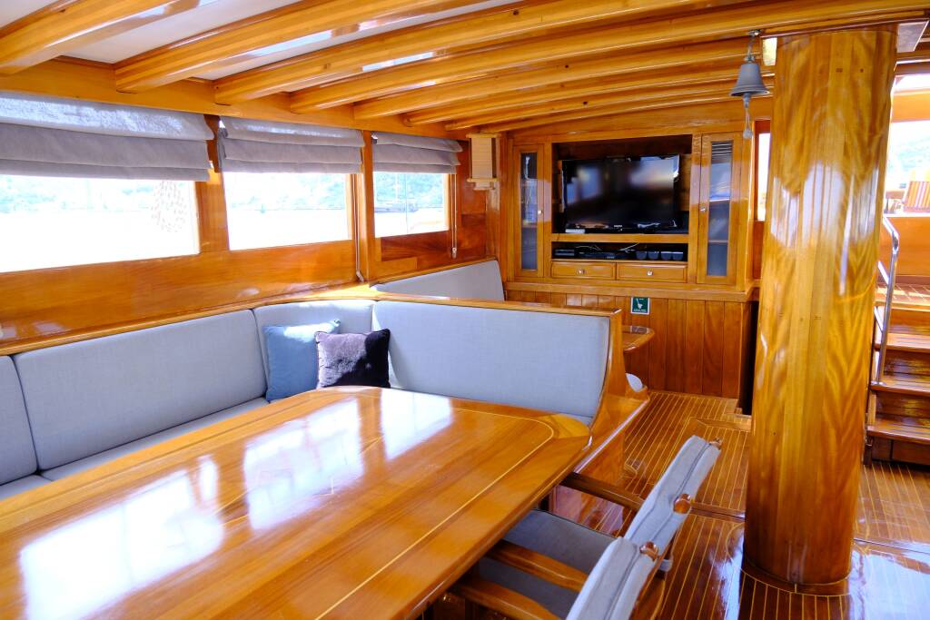 Auf dem Achterdeck finden Sie geräumige, gepolsterte Sitzgelegenheiten und einen Essbereich im Freien, wo Sie während der Fahrt entspannen und köstliche, frische Gerichte der türkischen und internationalen Küche nach den Rezepten Ihres Gourmetkochs genießen können.