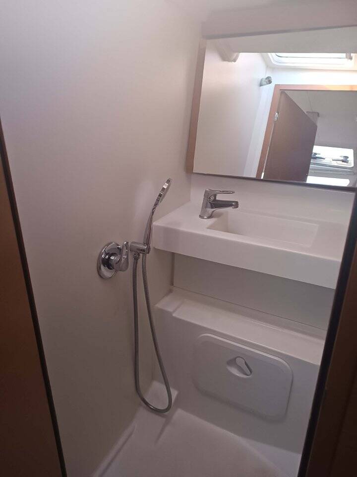 Segelyacht Sun Odyssey 440 Apollonas, Baujahr 2020, liegt im Corfu, Gouvia Marina, Ionisches Meer, Griechenland vor Anker. Es verfügt über 4 Kabinen und bietet Platz für 8 + 2 Personen mit 2 Toiletten.