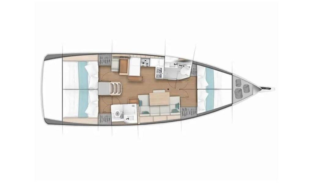 Segelyacht Sun Odyssey 440 Georgia, Baujahr 2018, liegt im Corfu, Gouvia Marina, Ionisches Meer, Griechenland vor Anker. Es verfügt über 4 Kabinen und bietet Platz für 10 Personen mit 2 Toiletten.