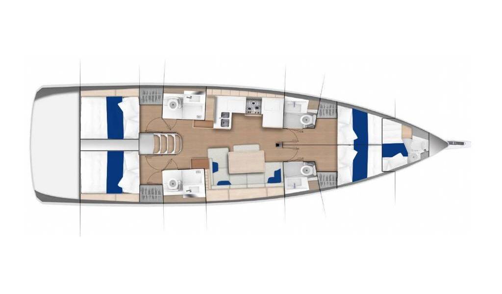 Segelyacht Sun Odyssey 490 Wanderlust, Baujahr 2020, liegt im Athens, Alimos marina, Athens area/Saronic/Peloponese, Griechenland vor Anker. Es verfügt über 4 + 1 Kabinen und bietet Platz für 8 + 2 + 1 Personen mit 4 + 1 Toiletten.