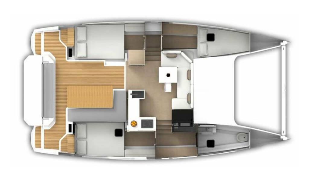 Catamaran Aventura 34 Jumping Fitness, built in 2019 is anchored in the Marina Mandalina, Sibenik, Šibenik region, Croatia. It has 3 cabins, can accommodate 6 + 2 people and has 1 toilets.