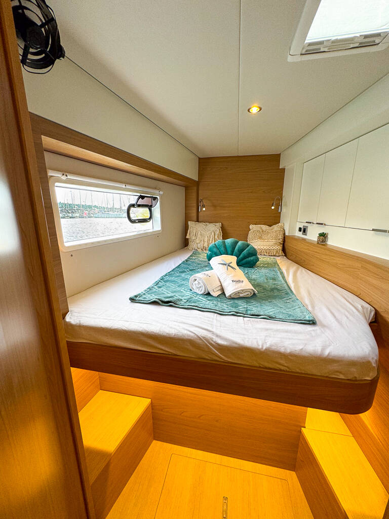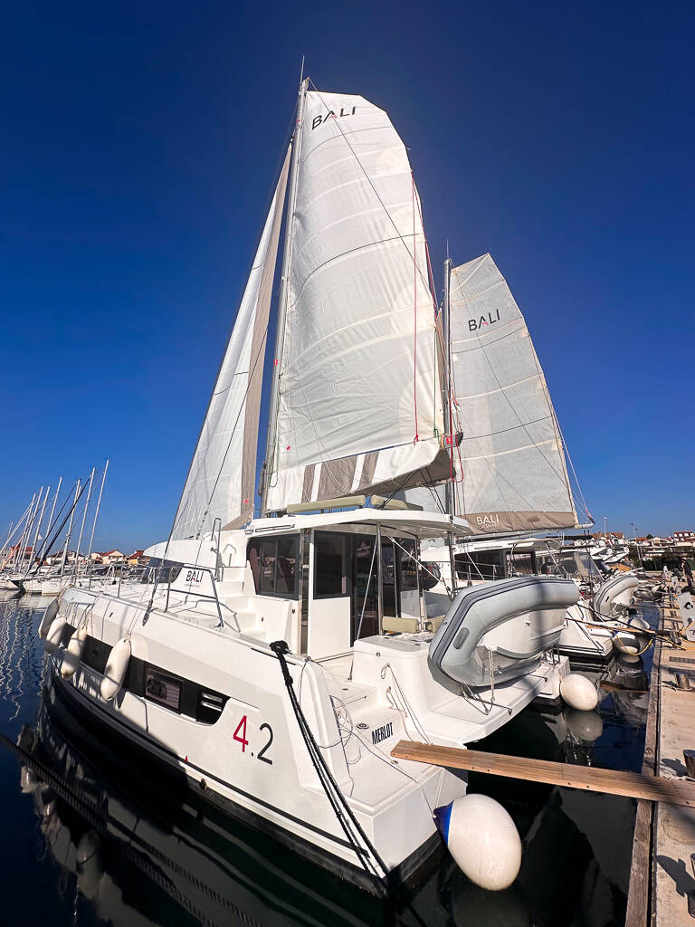Catamaran Bali 4.2 Merlot, built in 2024 is anchored in the Marina Pirovac, Šibenik region, Croatia. It has 4 + 1 cabins, can accommodate 8 + 2 + 1 people and has 4 + 1 toilets.