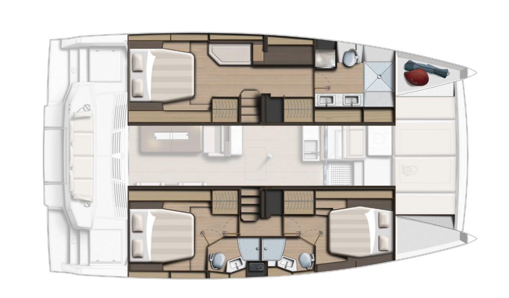 Catamaran Bali 4.4 Bliss, built in 2022 is anchored in the Capo D'orlando Marina, Sicily, Italy. It has 3 + 1 cabins, can accommodate 6 + 1 people and has 3 toilets.