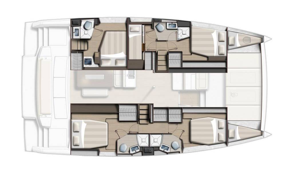 Catamaran Bali 4.6 Cancelli del Cielo, built in 2024 is anchored in the Ibiza, Club Nàutic Sant Antoni de Portmany, Balearic Islands, Spain. It has 5 + 1 cabins, can accommodate 10 + 1 + 1 people and has 4 toilets.