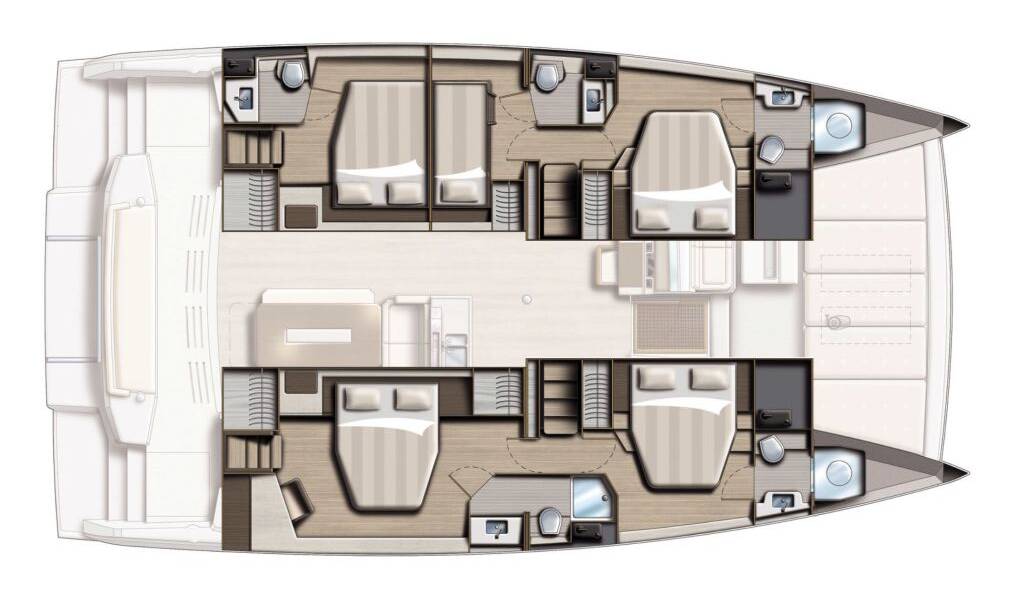 Catamaran Bali 4.8 AD MAIORA, built in 2023 is anchored in the Trogir, Yachtclub Seget (Marina Baotić), Split region, Croatia. It has 5 + 2 cabins, can accommodate 10 + 2 people and has 5 toilets.