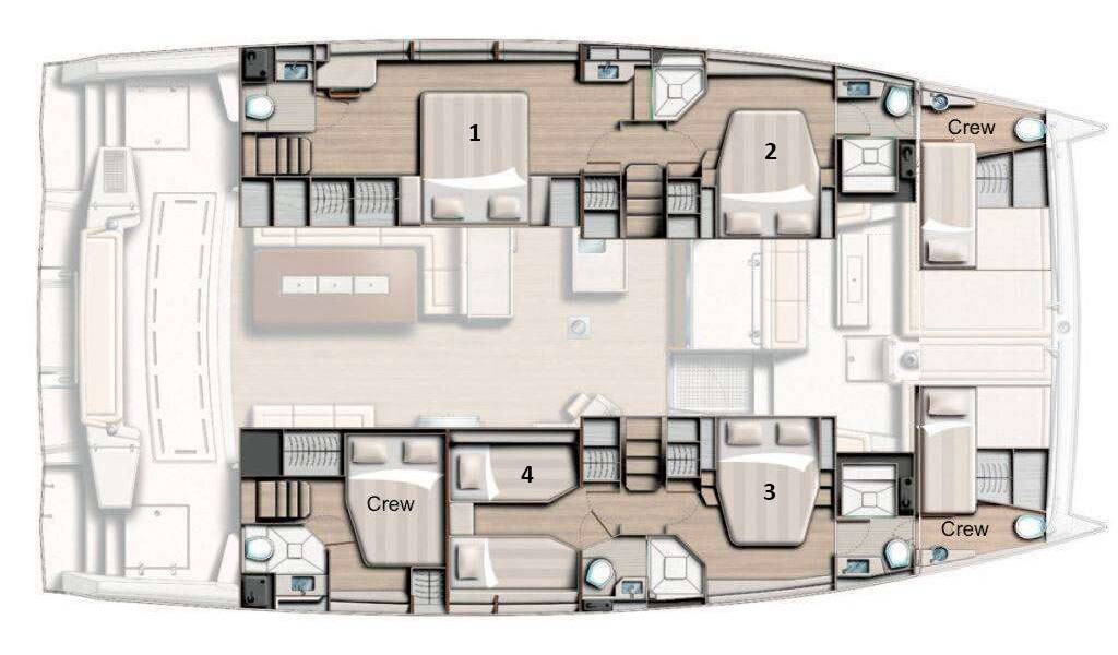 Catamaran Bali 5.4 Maia, built in 2024 is anchored in the Salerno, Marina d'Arechi, Campania, Italy. It has 4 + 3 cabins, can accommodate 8 people and has 4 + 3 toilets.