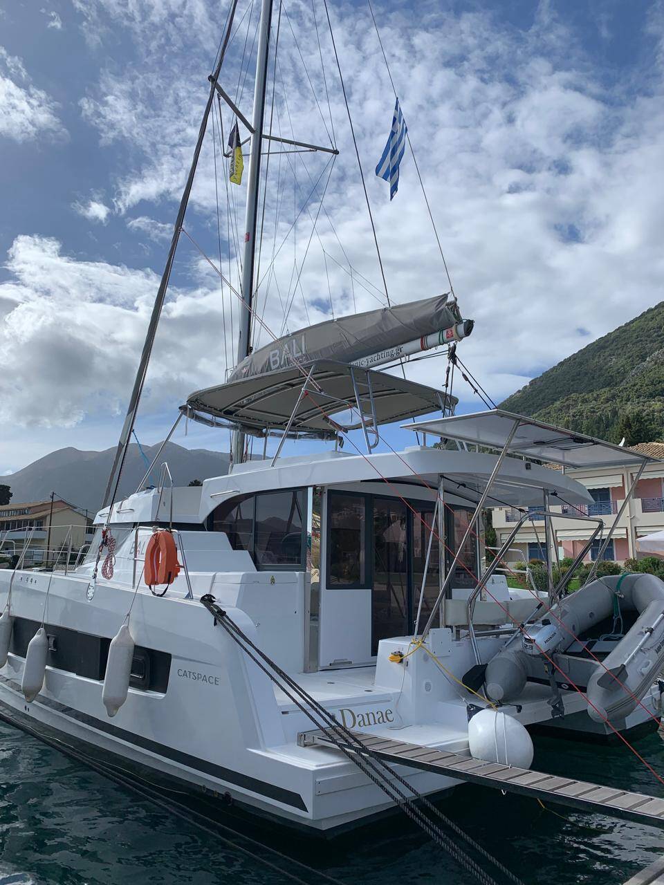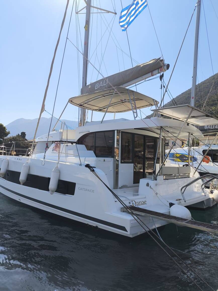 Catamaran Bali Catspace Danae, built in 2025 is anchored in the Lefkas, Perigiali, Ionian Islands, Greece. It has 4 cabins, can accommodate 10 + 2 people and has 4 toilets.