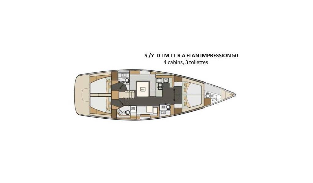 Sailing yacht Elan Impression 50 Dimitra, built in 2015 is anchored in the Corfu, Gouvia Marina, Ionian Islands, Greece. It has 4 cabins, can accommodate 8 + 2 people and has 3 toilets.